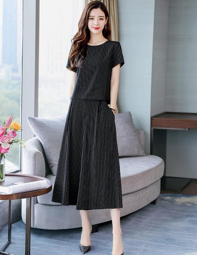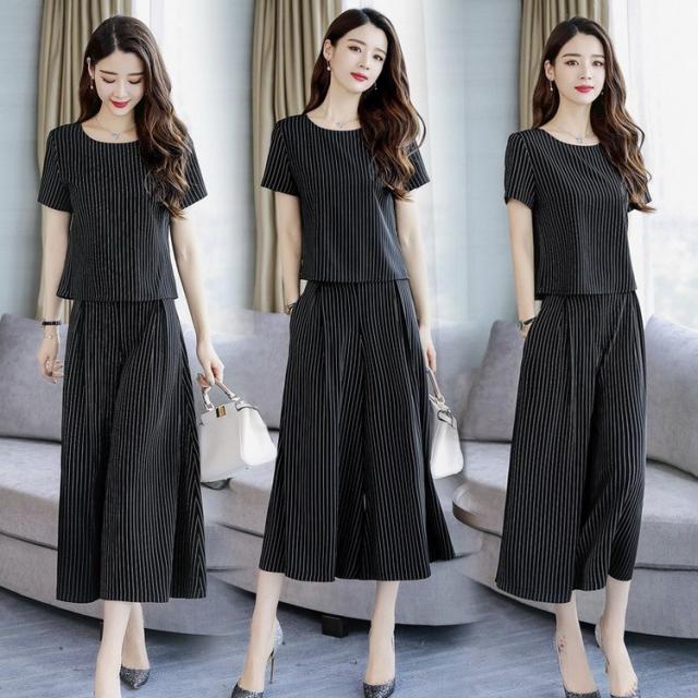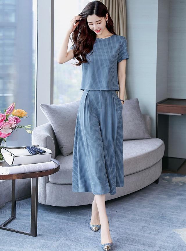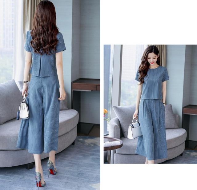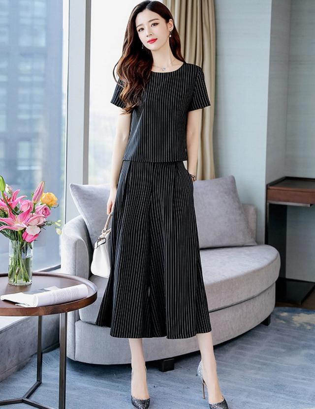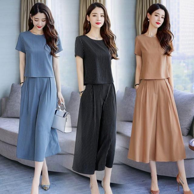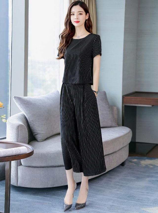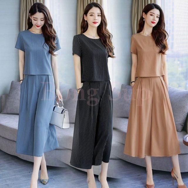 セットアップ レディース きれいめ ズボン 40代 夏 半袖 七分丈パンツ ストライプ 上下セット 韓国風 通勤 OL オシャレ 上品 セットアップ