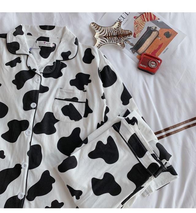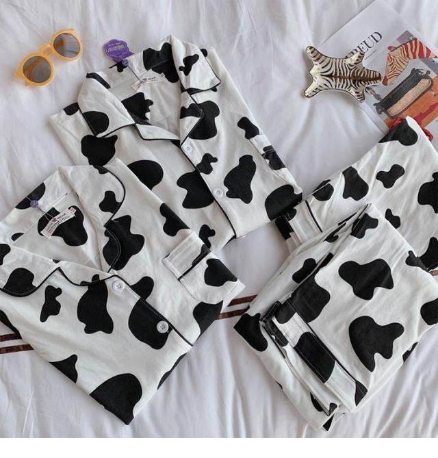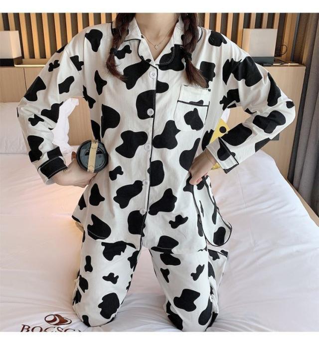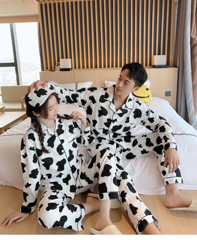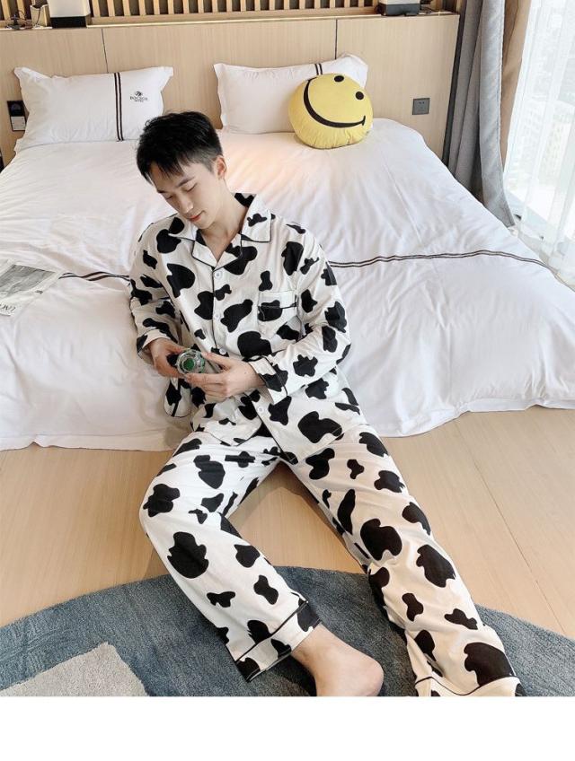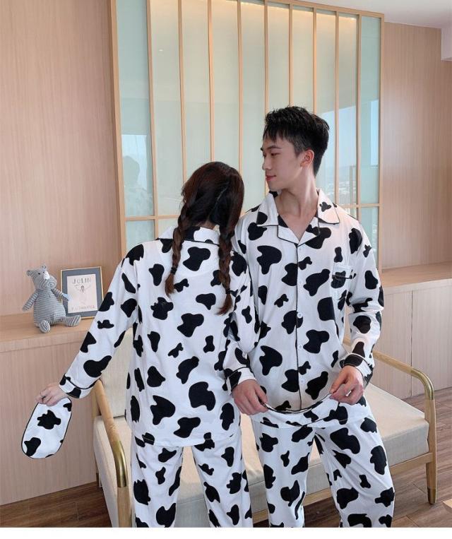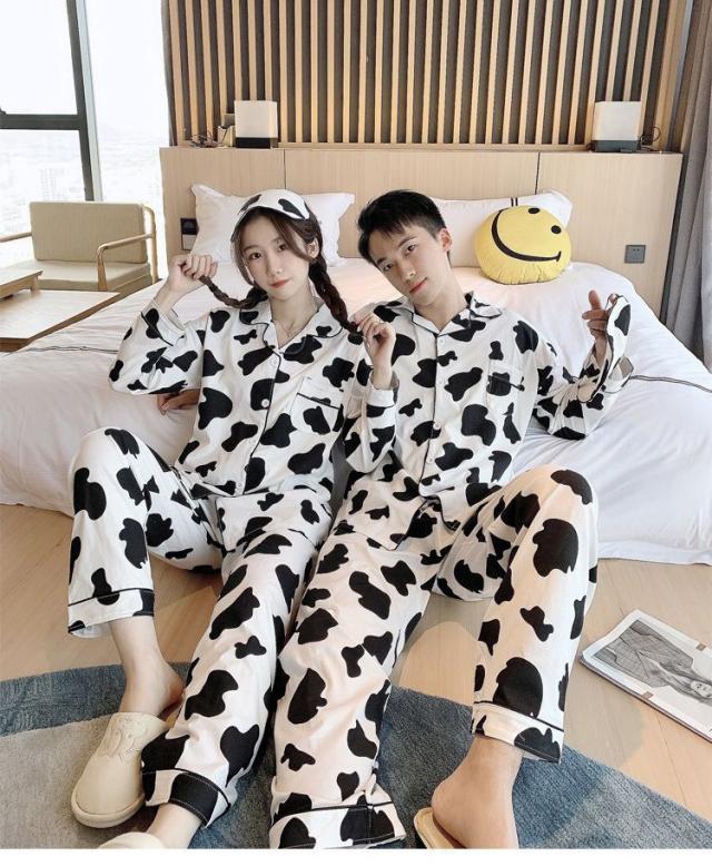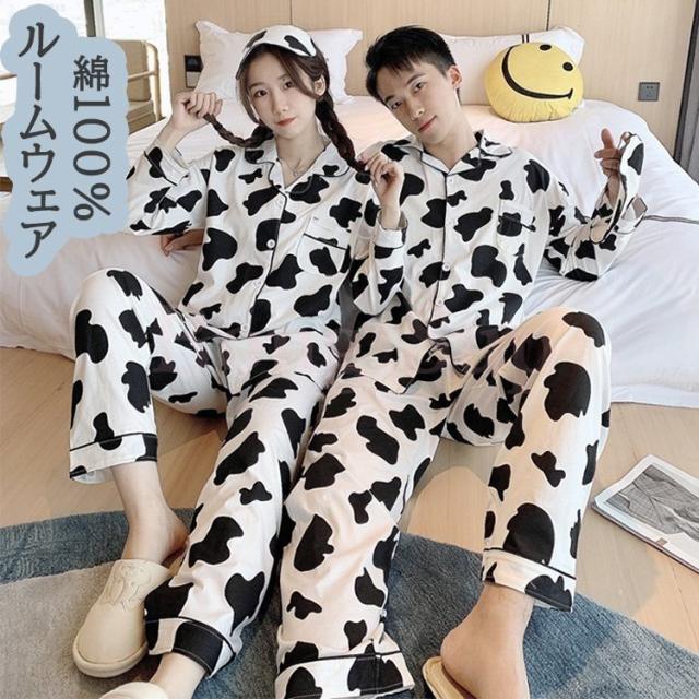 ヘアパジャマ カップルルームウェア レディース/メンズ 春秋 長袖パジャマ 前開き ロングズボン 綿100% 上下セット 乳牛柄 ペアルック 部屋着プレゼント