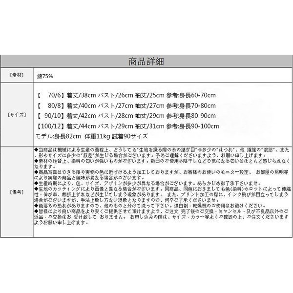 | サイズについての説明 | サイズ: 【 70/6】着丈/38cm バスト/26cm 袖丈/25cm 参考:身長60-70cm 【 80/8】着丈/40cm バスト/27cm 袖丈/27cm 参考:身長70-80cm 【 90/10】着丈/42cm バスト/28cm 袖丈/29cm 参考:身長80-90cm 【100/12】着丈/44cm バスト/29cm 袖丈/31cm 参考:身長90-100cm モデル:身長82cm 体重11kg 試着90サイズ |