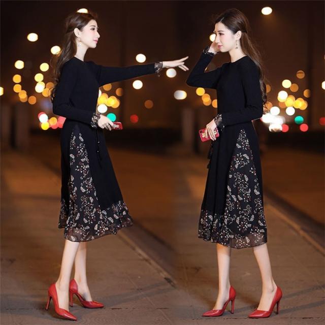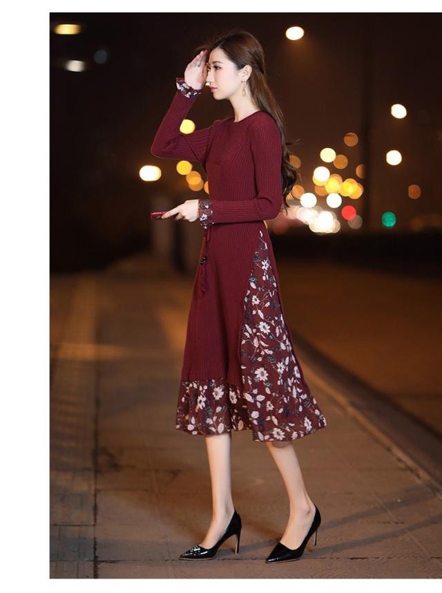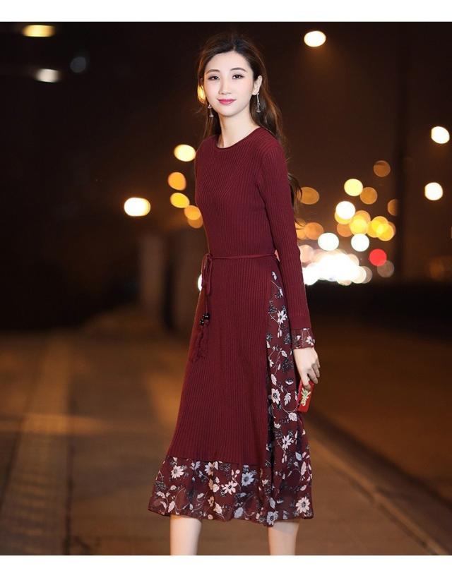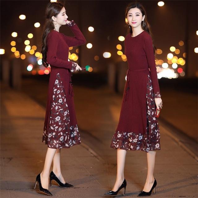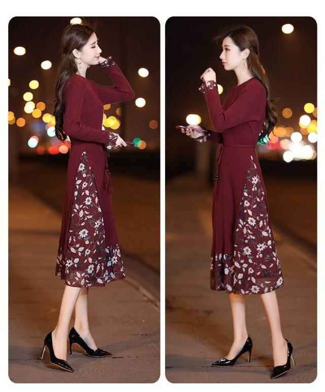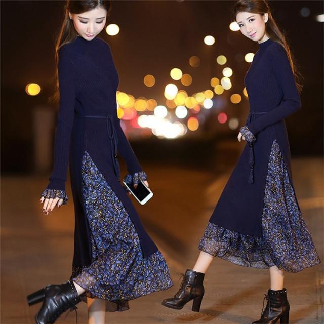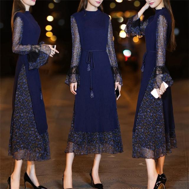 レディース ニットワンピース ドレス メリヤス フレア 花柄 長袖 プリーツ ルロング丈 秋冬 ワンピース シフォン 韓国風 着痩せ 上品 通勤 30代40代 新作