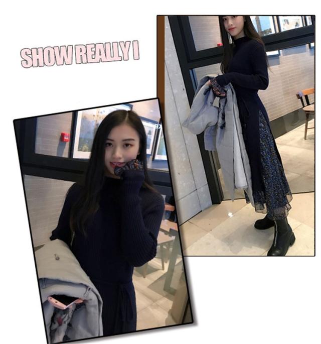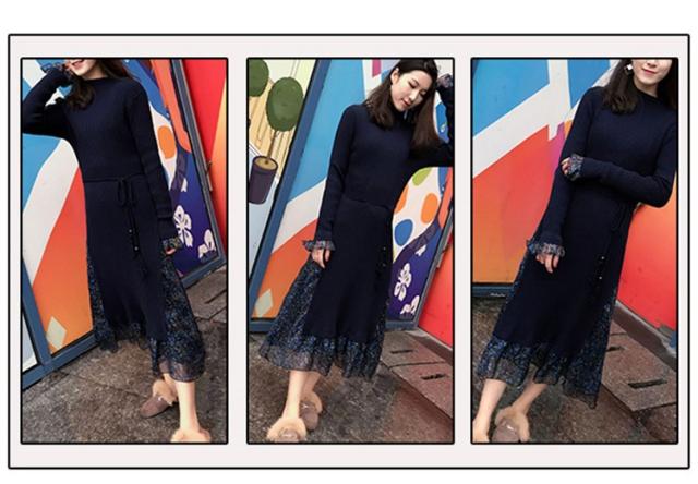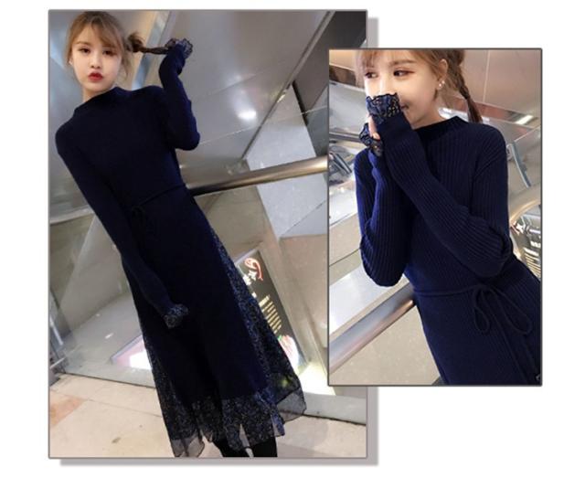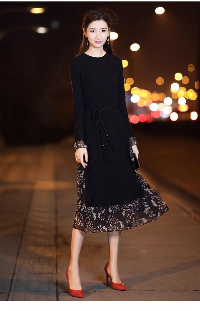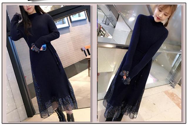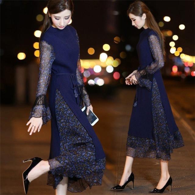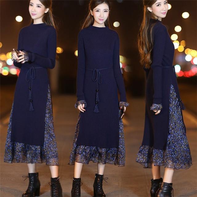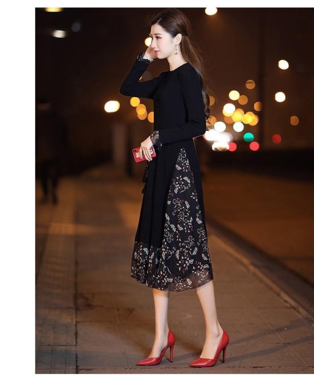 レディース ニットワンピース ドレス メリヤス フレア 花柄 長袖 プリーツ ルロング丈 秋冬 ワンピース シフォン 韓国風 着痩せ 上品 通勤 30代40代 新作