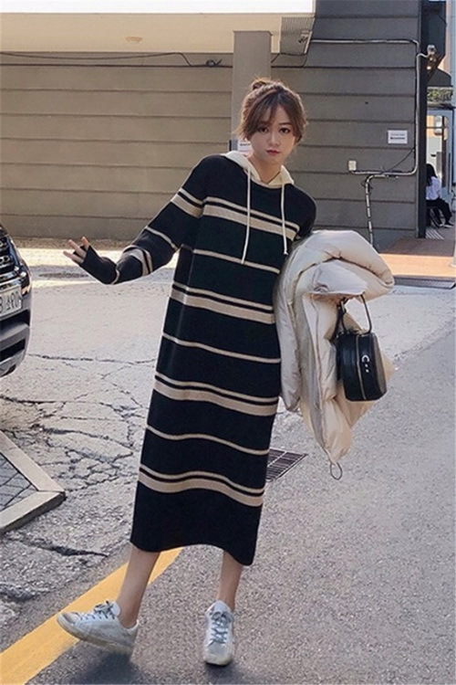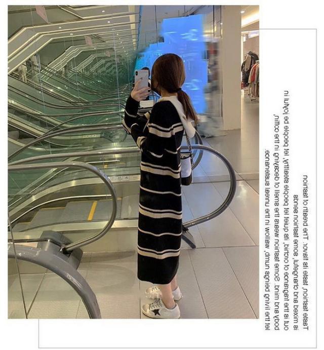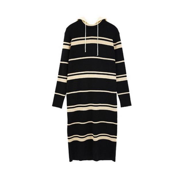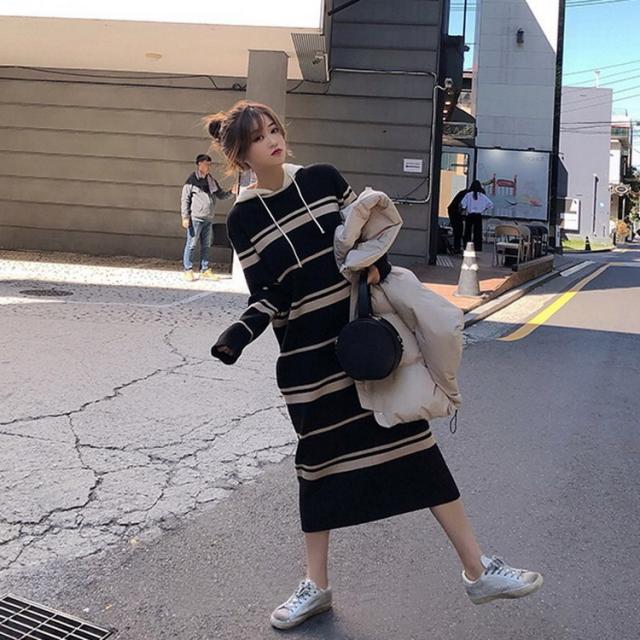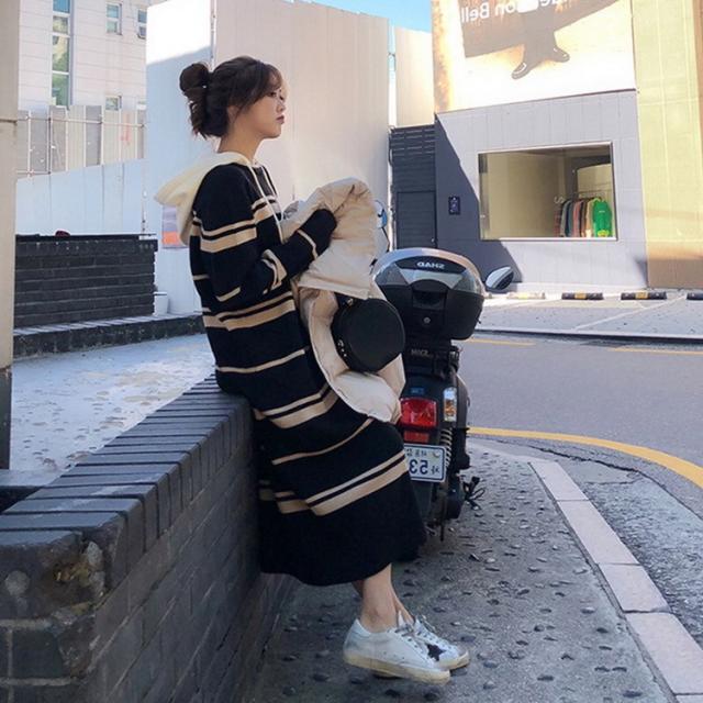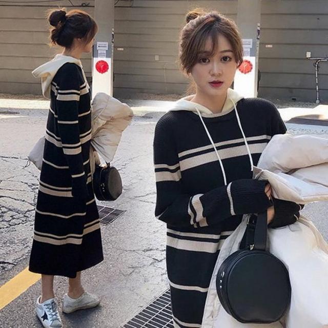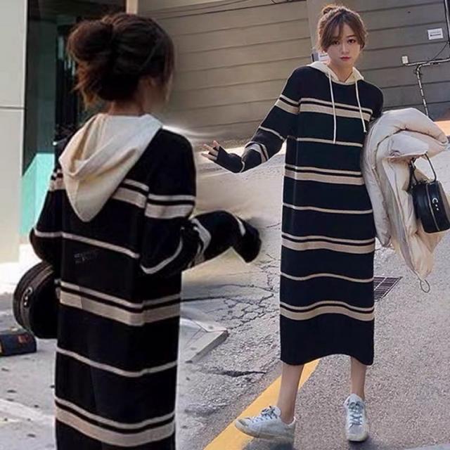 ニットワンピース レディース 40代 秋冬 長袖 ニットワンピース パーカー 大きいサイズ ボーダー柄セーター ひざ下 きれいめ 上品 通勤 韓国風 ゆったり 着痩せ