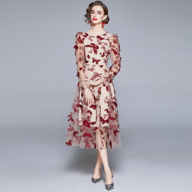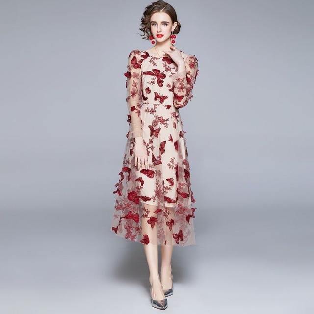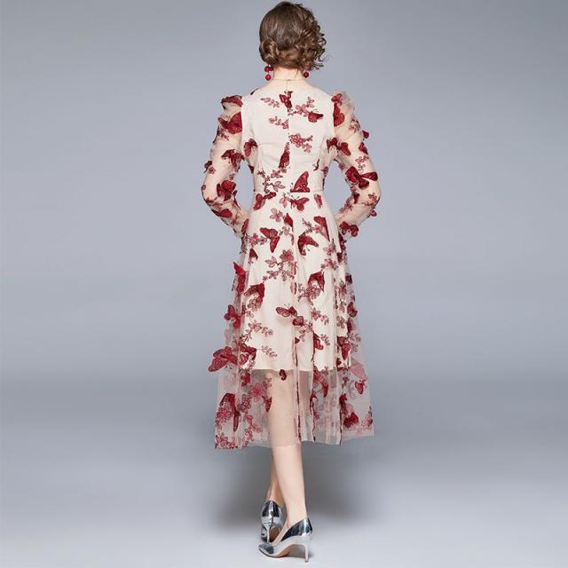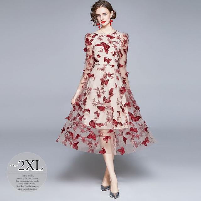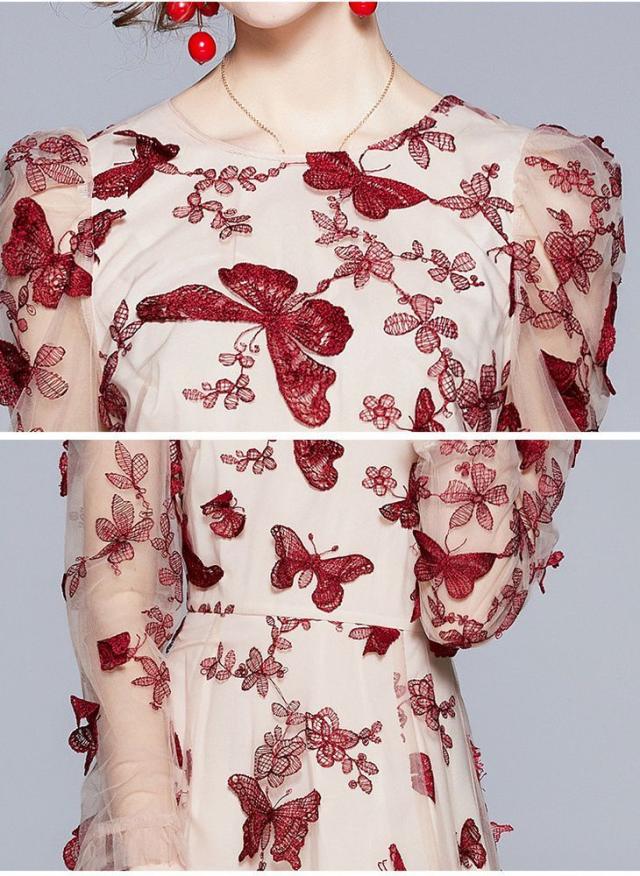 ドレス ラウンドネック フレアワンピ シースルー 袖口フリル 蝶 ロングワンピース 透け感 ロマンティック ふんわり 演奏会