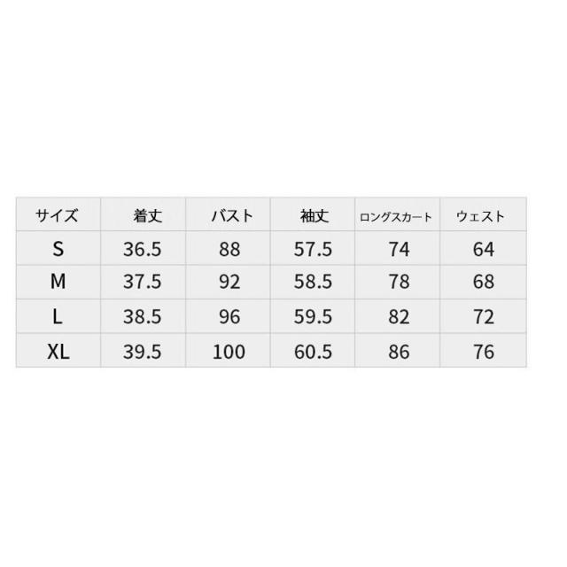 | サイズについての説明 | 商品詳細 カラー:写真色 サイズ:S,M,L,XL サイズ参照表(CM) S:バスト88 袖丈57.5 着丈36.5 ウエスト64 スカート丈74 M:バスト92 袖丈58.5 着丈37.5 ウエスト68 スカート丈78 L:バスト96 袖丈59.5 着丈38.5 ウエスト72 スカート丈82 XL:バスト100 袖丈60.5 着丈39.5 ウエスト76 スカート丈86 ご注意:個人採寸のため、1〜3cmの誤差は正常範囲内となりますが、ご了承ください |