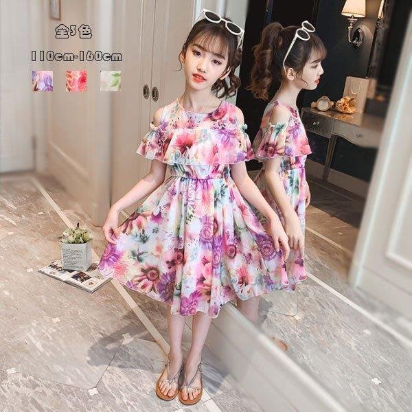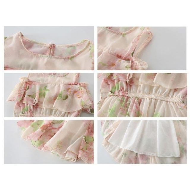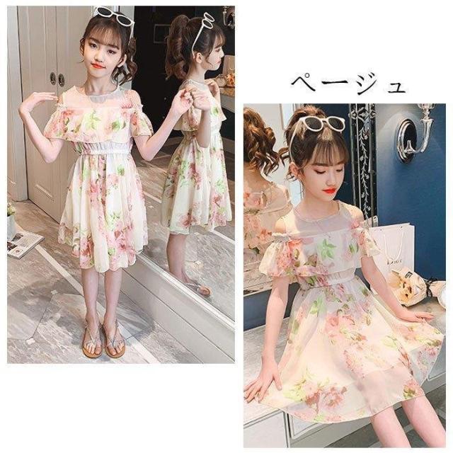 子ども服 女の子 ワンピース 花柄 シフォン スウィート ビーチドレス シーサイド リゾート キッズ 姉妹 夏ワンピ 半袖 膝丈 結婚式 イベント 誕生日 110-160