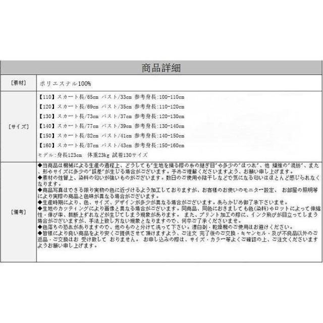 | サイズについての説明 | サイズ: 【110】スカート長/65cm バスト/33cm 参考身長:100-110cm 【120】スカート長/69cm バスト/35cm 参考身長:110-120cm 【130】スカート長/73cm バスト/37cm 参考身長:120-130cm 【140】スカート長/77cm バスト/39cm 参考身長:130-140cm 【150】スカート長/82cm バスト/41cm 参考身長:140-150cm 【160】スカート長/87cm バスト/43cm 参考身長:150-160cm モデル:身長123cm 体重23kg 試着130サイズ 注意事項: ※ 平置き素人採寸ですので多少の誤差はご容赦下さい。 ※ モニタ環境によって、商品の色合いが多少違う場合があります。 |