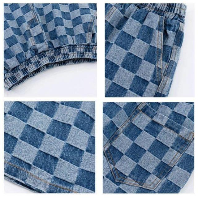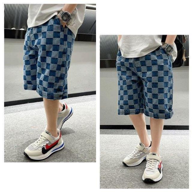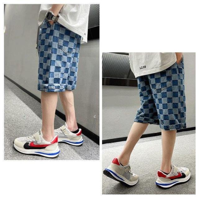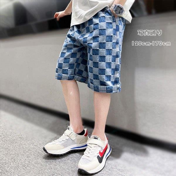 子ども服 男の子 ジーンズ 五分丈 ゆったり 夏着 キッズ ボーイズ ボトムス パンツ チェック柄 ブルー カジュアル 通学 ジュニア 半ズボン ハーフパンツ 120-170