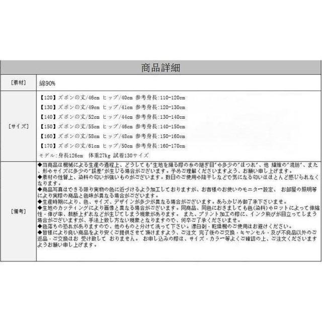 | サイズについての説明 | サイズ: 【120】ズボンの丈/46cm ヒップ/40cm 参考身長:110-120cm 【130】ズボンの丈/49cm ヒップ/41cm 参考身長:120-130cm 【140】ズボンの丈/52cm ヒップ/44cm 参考身長:130-140cm 【150】ズボンの丈/55cm ヒップ/46cm 参考身長:140-150cm 【160】ズボンの丈/58cm ヒップ/48cm 参考身長:150-160cm 【170】ズボンの丈/61cm ヒップ/50cm 参考身長:160-170cm モデル:身長126cm 体重27kg 試着130サイズ 注意事項: ※ 平置き素人採寸ですので多少の誤差はご容赦下さい。 ※ モニタ環境によって、商品の色合いが多少違う場合があります。 |