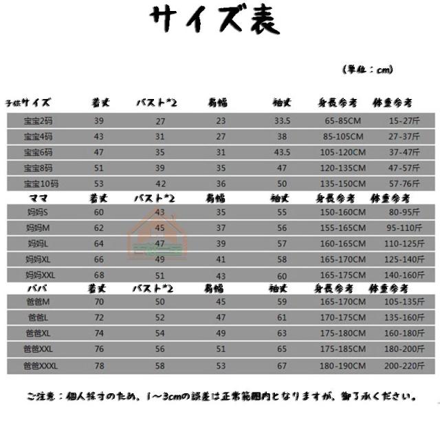 | 色 | 子供2 子供4 子供6 子供8 子供10 パパS パパM パパL パパXL パパXXL パパXXXL ママS ママM ママL ママXL ママXXL |
