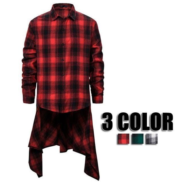 シャツ メンズ カットソー 不規則 ロングTシャツ 長袖 トップス 丸首Tシャツ チェックシャツ 秋冬 メンズ 3色