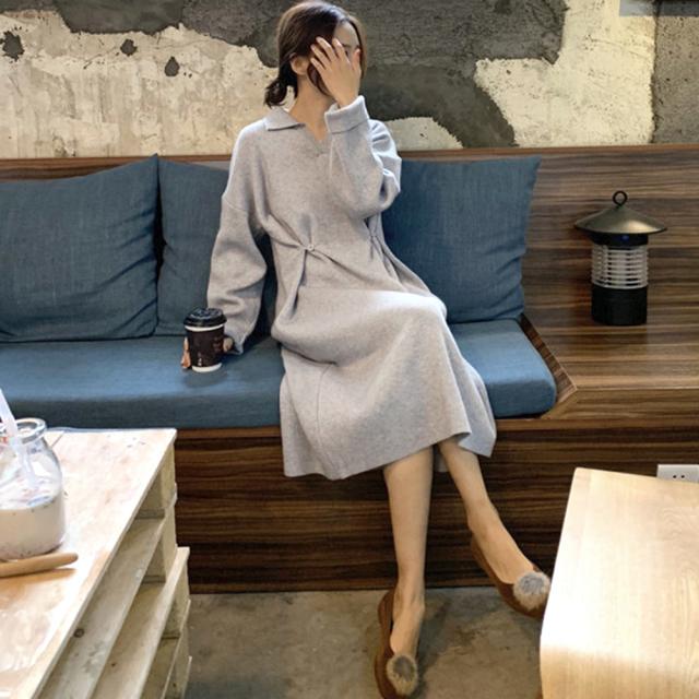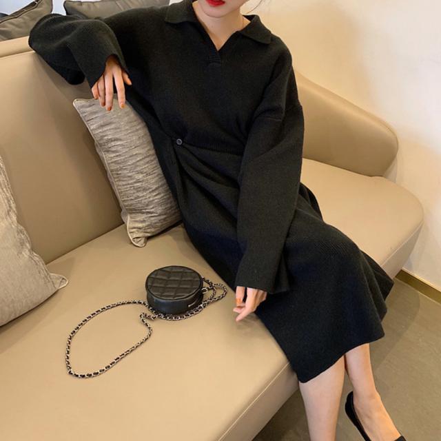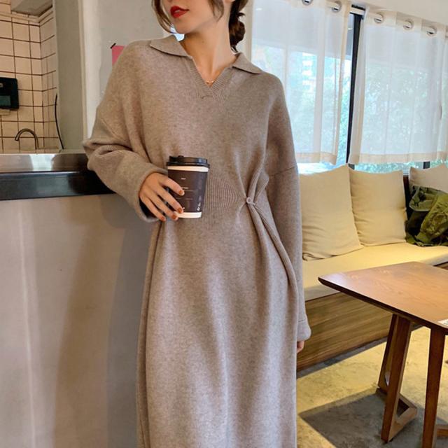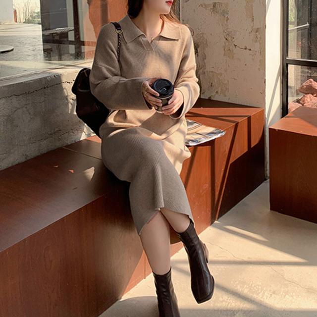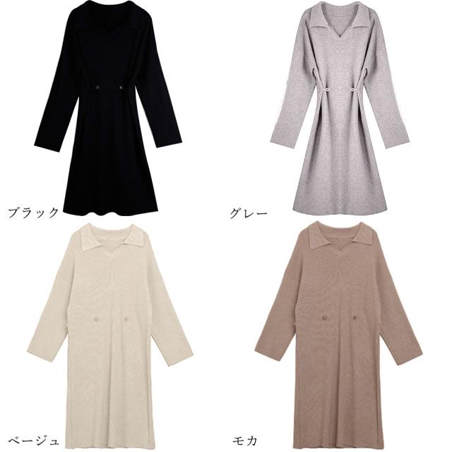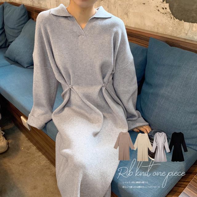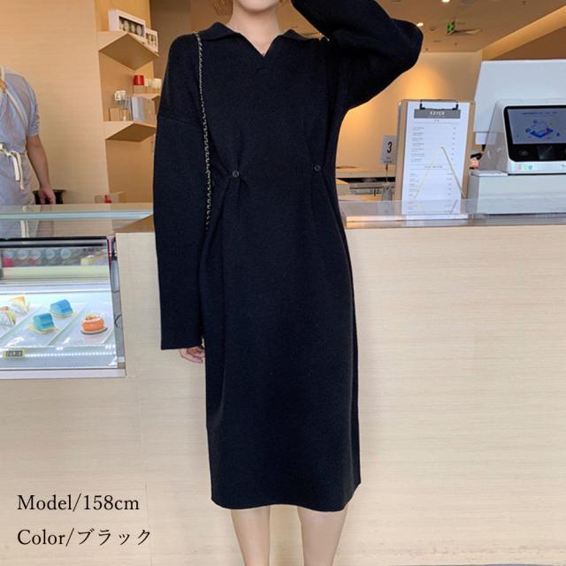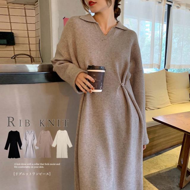 リブニットワンピース レディース ゆったり ロングワンピース 襟付き 長袖ワンピース 膝下 大人 セーターワンピース 無地