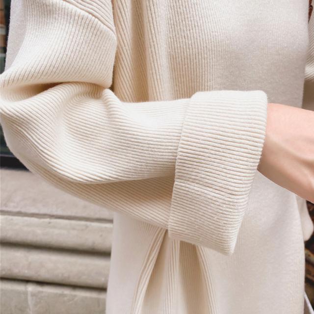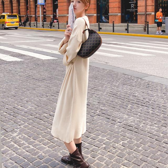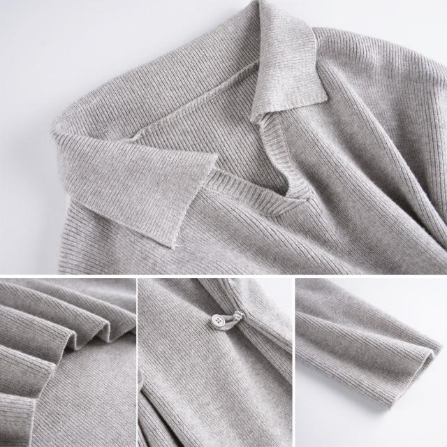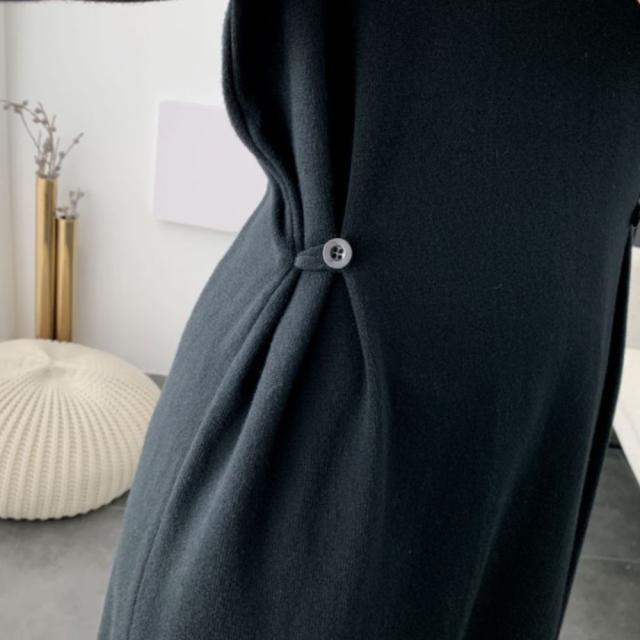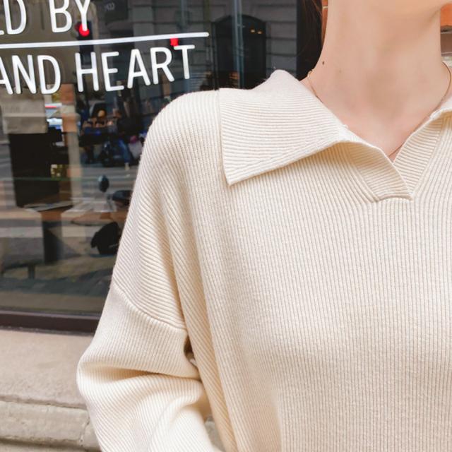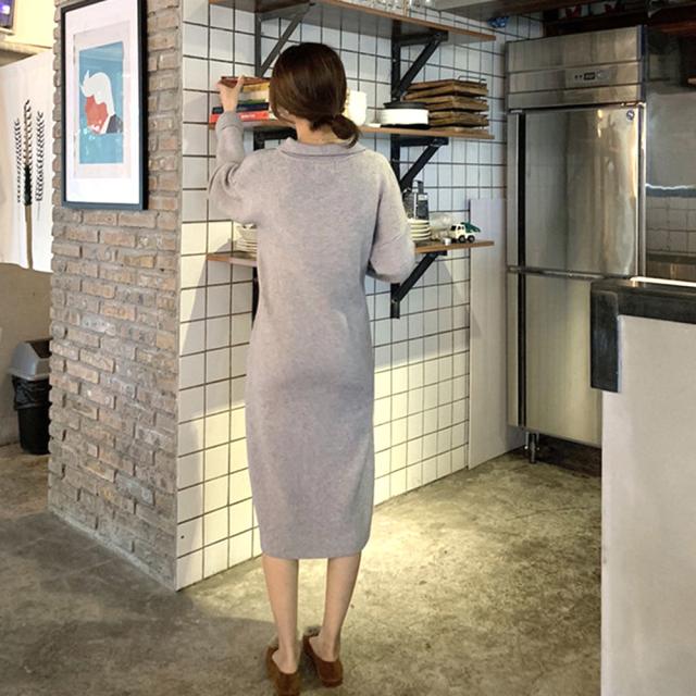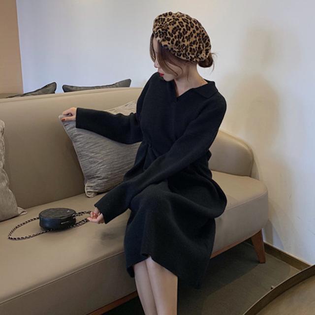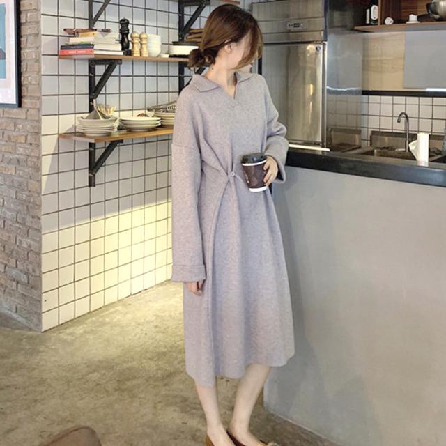 リブニットワンピース レディース ゆったり ロングワンピース 襟付き 長袖ワンピース 膝下 大人 セーターワンピース 無地
