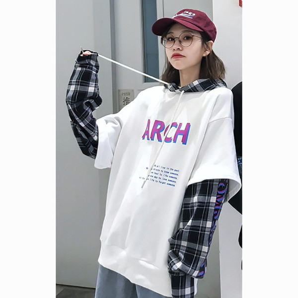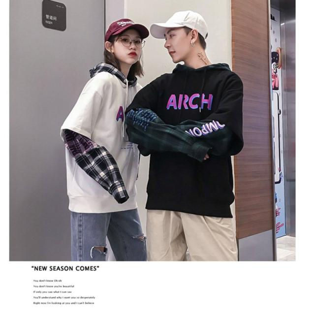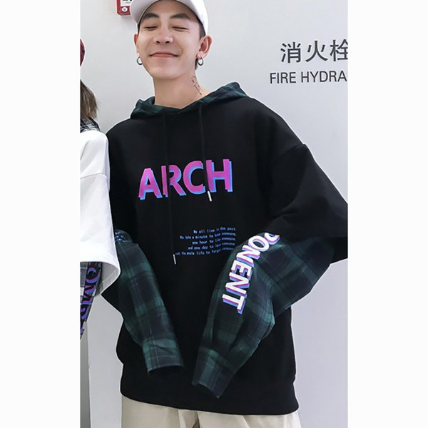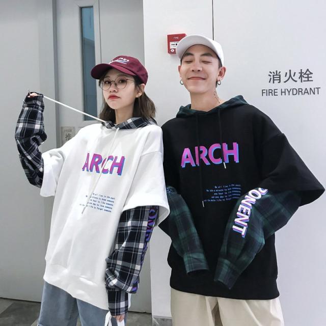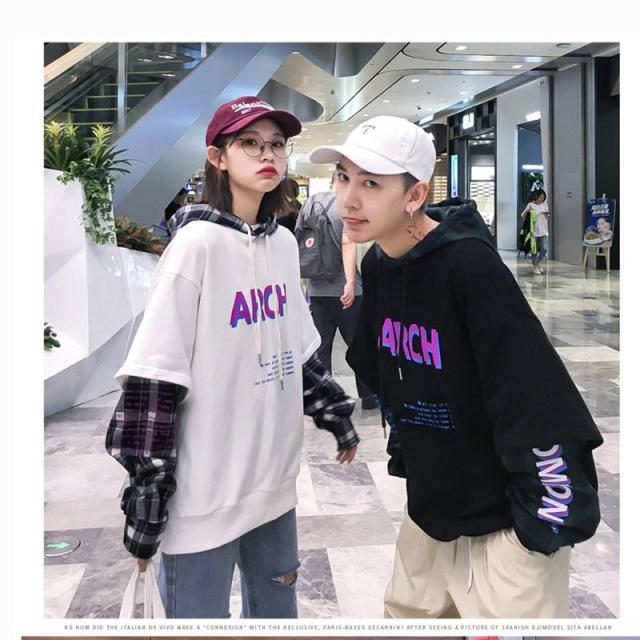 カップルルック重ね着風 パーカー 切替 韓国 ストリート ロゴ トレーナー 原宿系 ドッキング スウェット トップスカップルルック