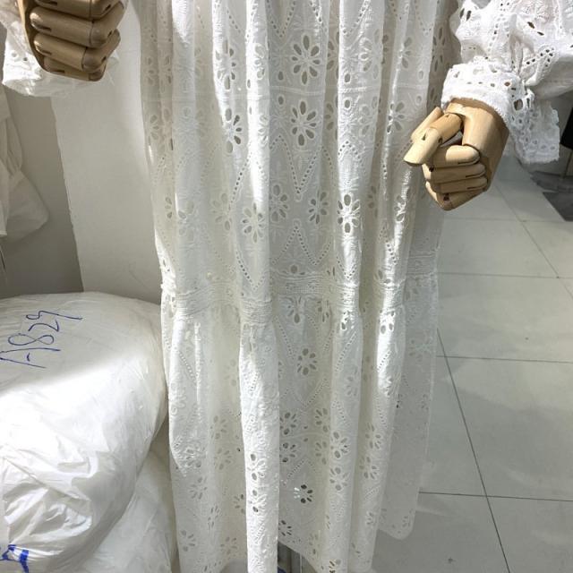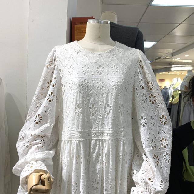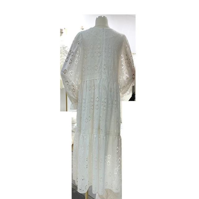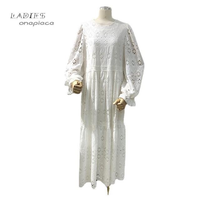 ワンピース レディース ラウンドネック ロング丈 ストレート レース柄 花 袖フリル バックファスナー ホワイト ガーリー フェミニン かわいい おし