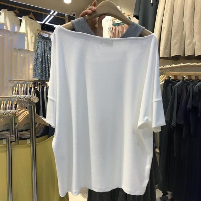 カットソー Tシャツ 半袖 レディース 女性用 トップス フェイクレイヤード 重ね着風 ドロップショルダー オフショルダー 肩出し バイカラー シンプ