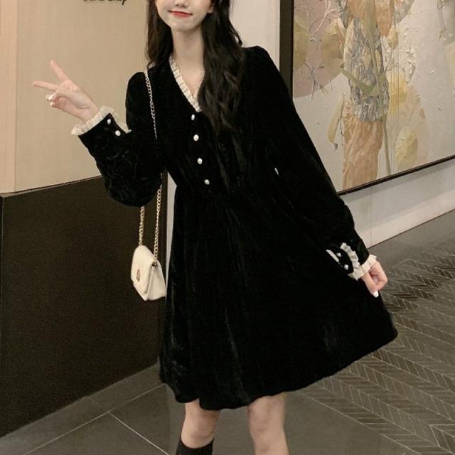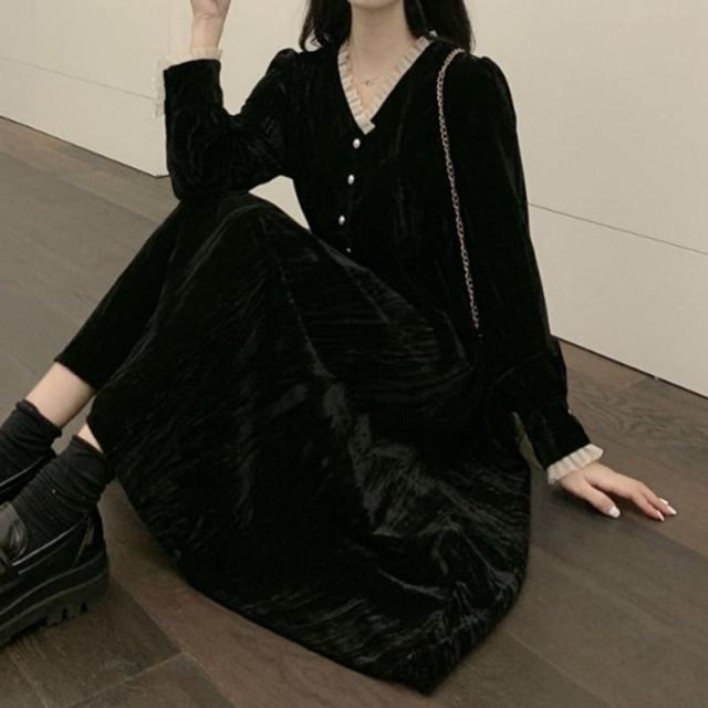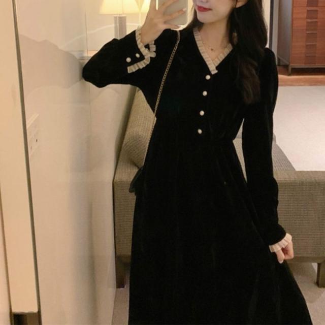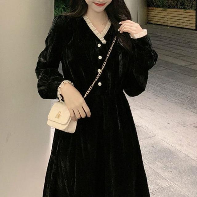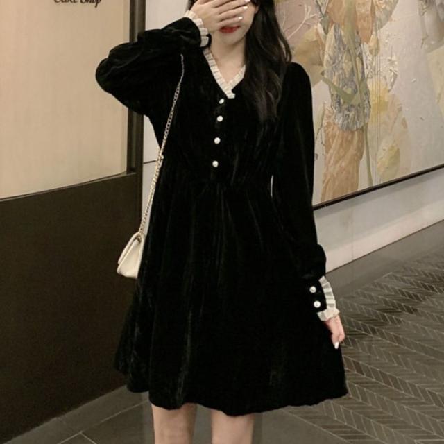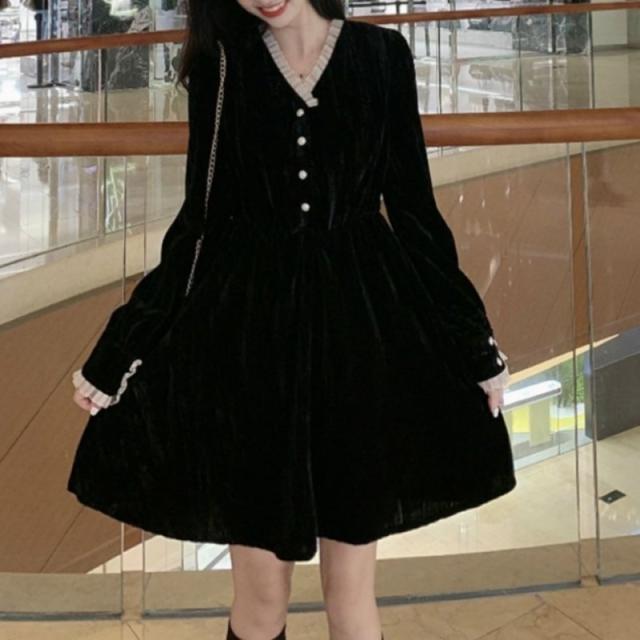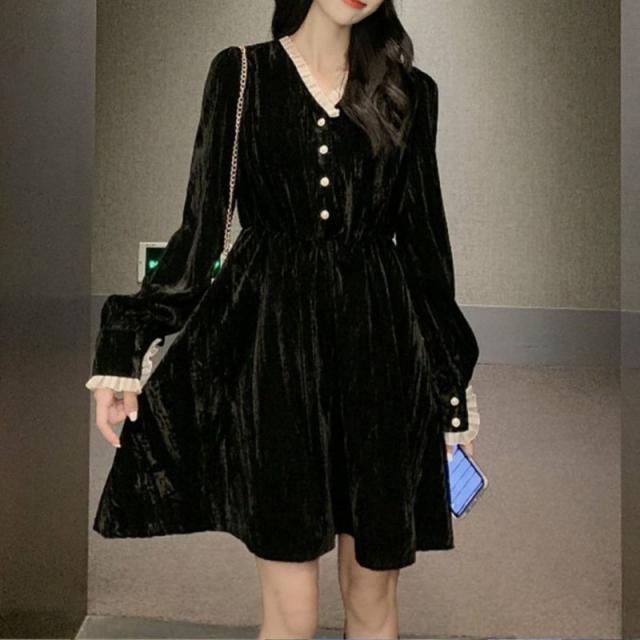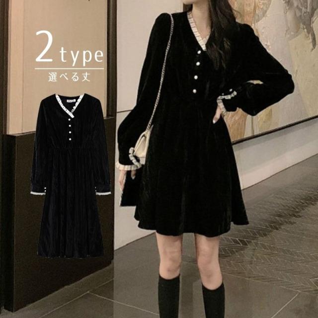 ワンピース ショート丈 ロング丈 Aライン 長袖 Vネック レディース 女性 婦人服 フリル ひざ上丈 ミモレ丈 上品 シック かわいい おしゃれ ブ