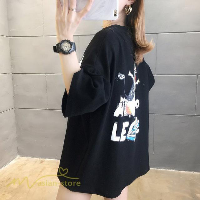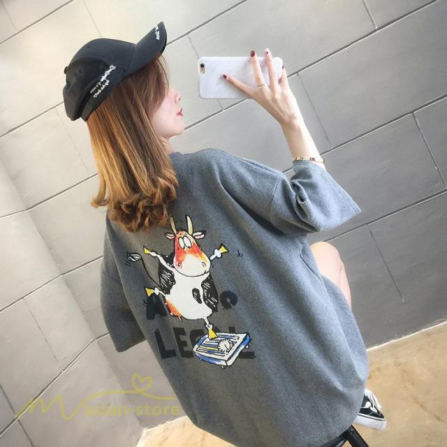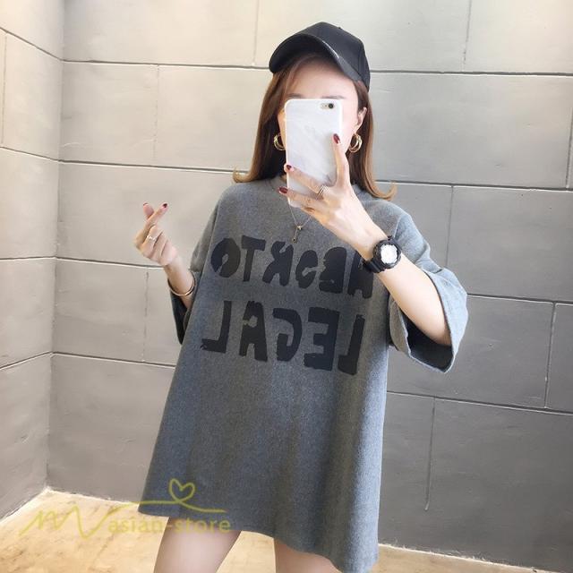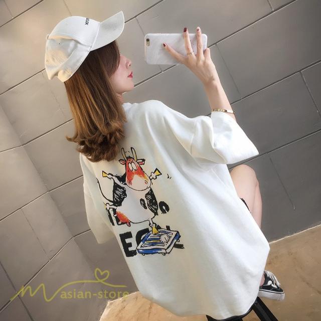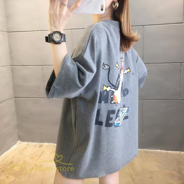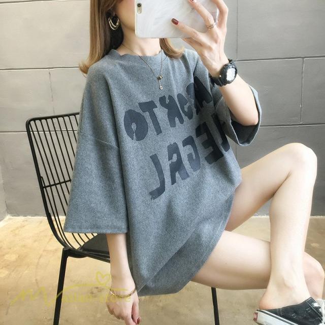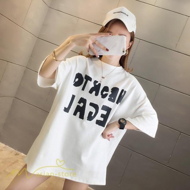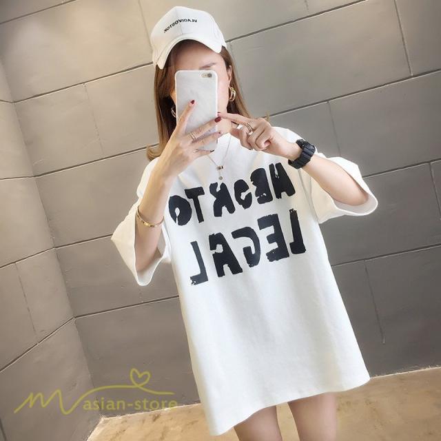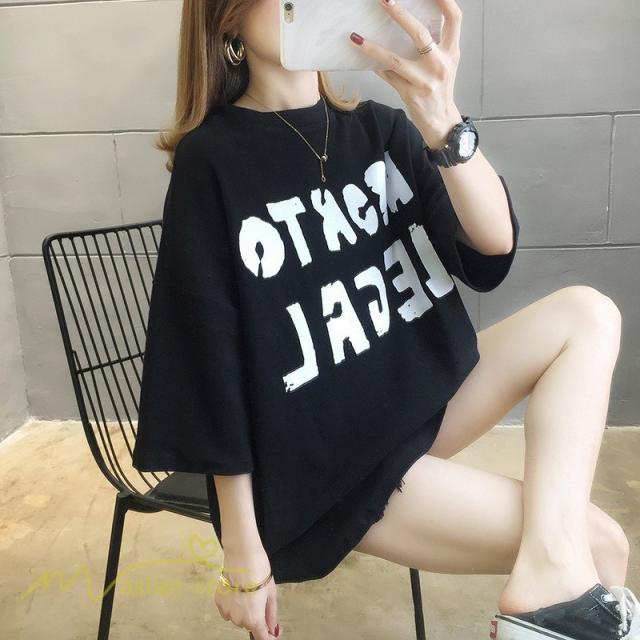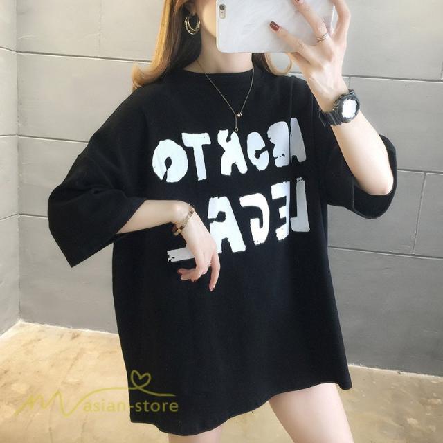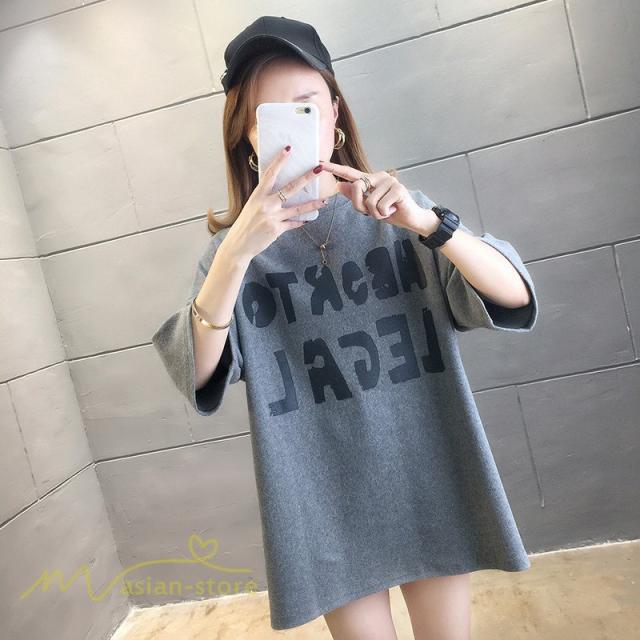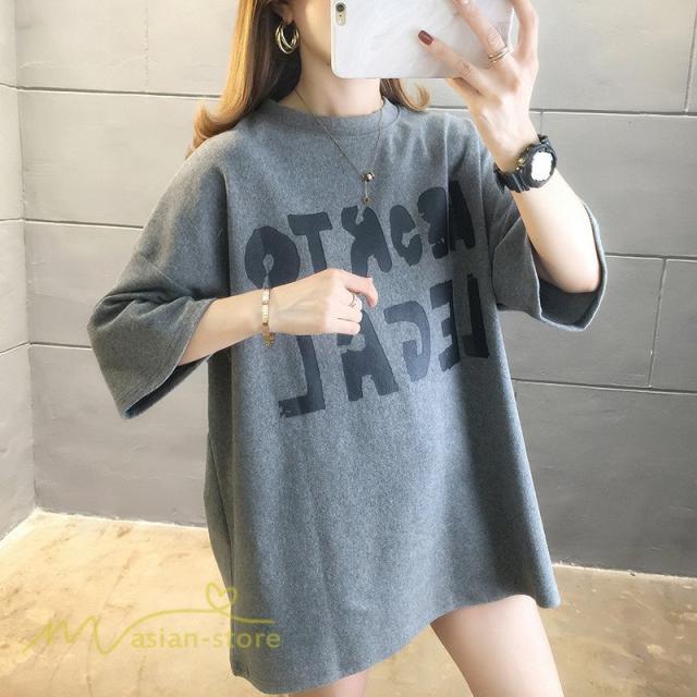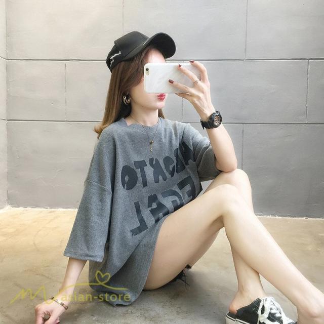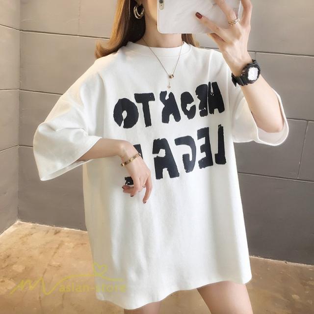 Tシャツ トップス レディース 韓国風 ワイドTシャツ おしゃれ 2021新作 プリント ゆったり 7分袖 カジュアルTシャツ 丸首 ロング丈 女性 コットン 綿 人気 上品
