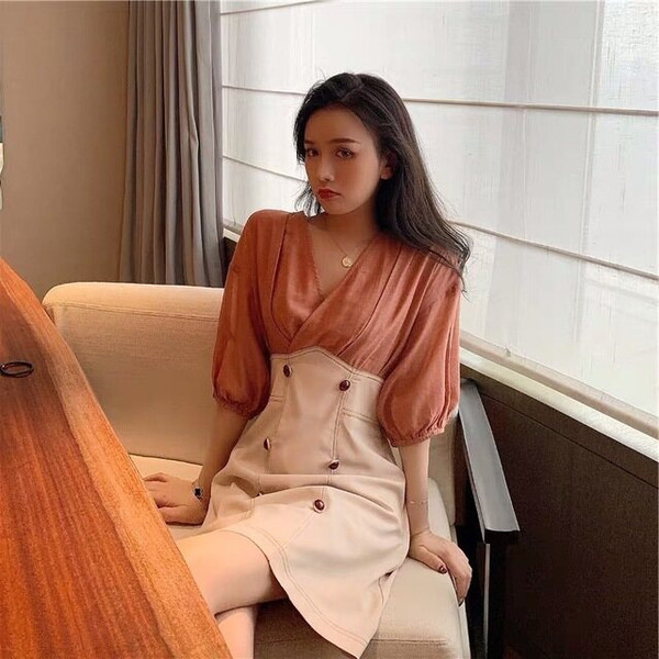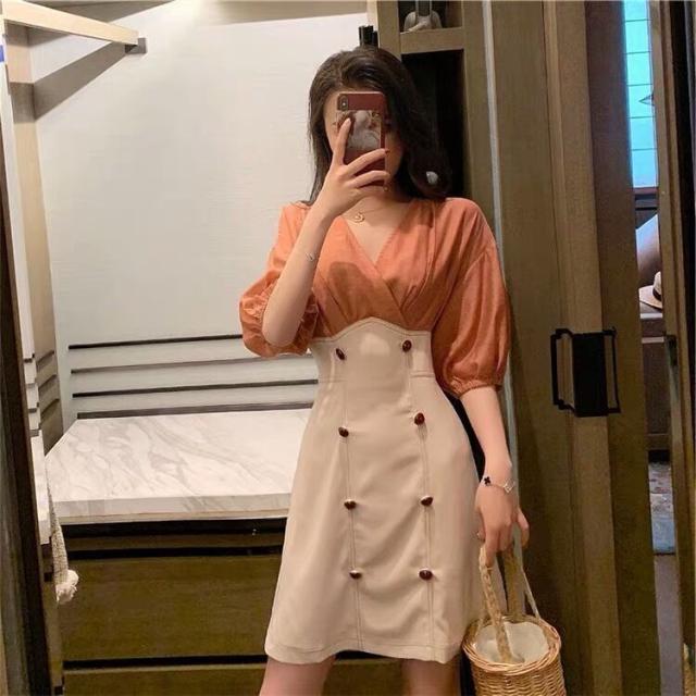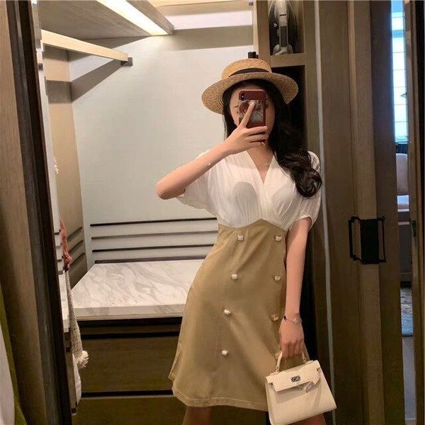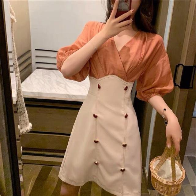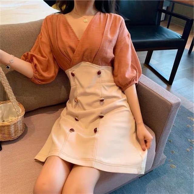 ワンピース Aライン 安い 可愛い ワンピ ミニ ドレス デート 食事会 ディナー 大人可愛い 配色 コンビ 半袖 Vネック OL 通勤
