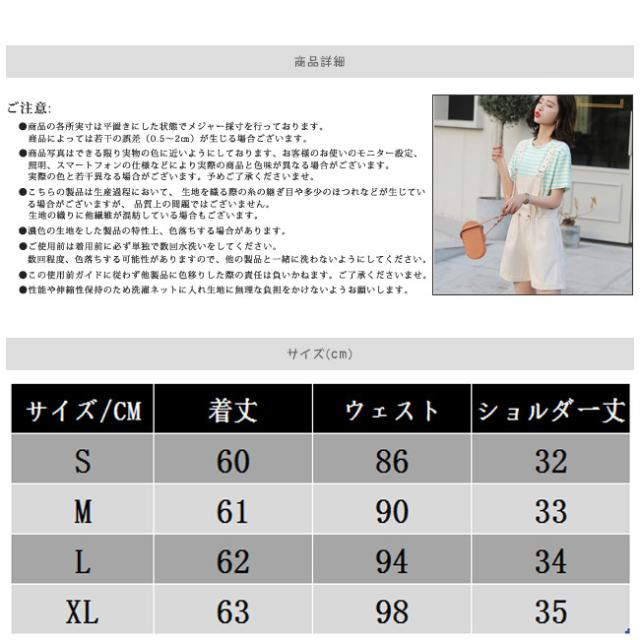 | サイズについての説明 | ボダンは前にあるため、着脱が容易にできで、春から秋までのコーデに必ず取り入れることをお勧めます。 見た目はしっかり上品で、着心地は軽やかなサロペットです。 【注意】 *画面上と実物では多少色具合が異なって見える場合もございます。 *商品には多少の個体差がございます。予めご了承くださいませ。 *サイズ表記は目安です。誤差はご了承ください。 *商品は縫製上の細かいほつれ、インク飛び、織りむら、汚れ、素材特有の臭いや接着剤等の臭いが残っている場合がございますので、気になるお客様はご購入をお控え下さい。 |