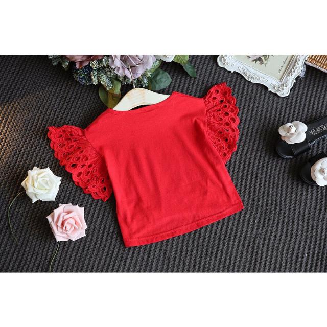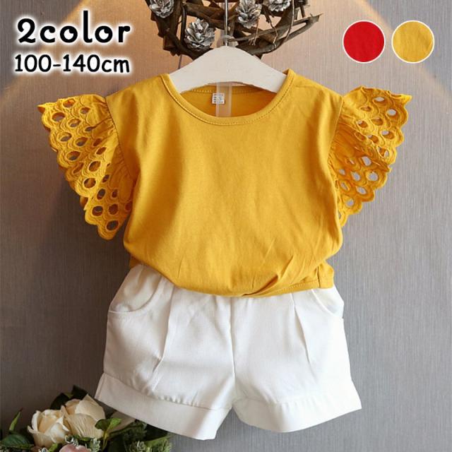 セットアップ 上下セット 子供服 キッズ ジュニア 女の子 半袖 カットソー スカラップ レース袖 ラウンドネック ショートパンツ 短パン おしゃれ