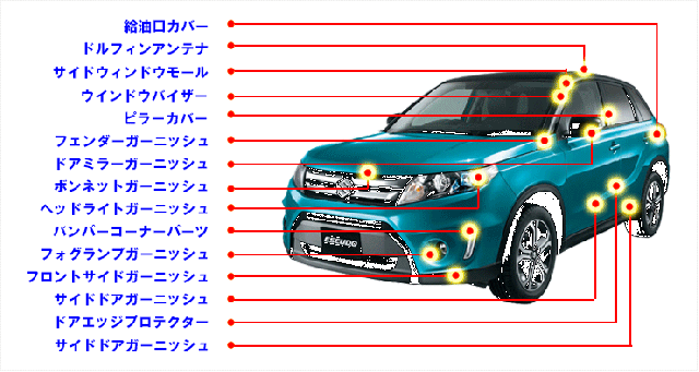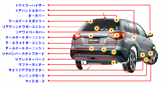 | サイズについての説明 | [適合機種] 型式:SUZUKI ESCUDO 2015年10月〜 タイプ:ガゾリン車 1.6/1.4ターボ(2WD YD21S/4WD YE21S) [商品内容] 商品数量:1P [取付方法] カバー取付 |