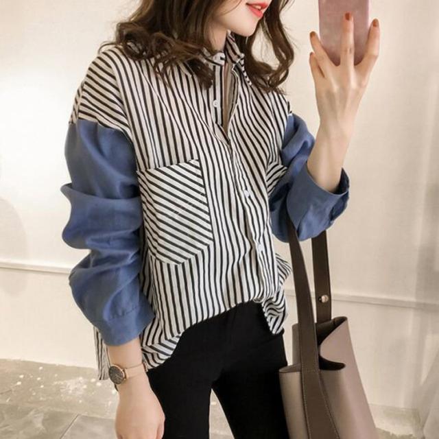 seiu- ブラウス シャツ レディース 長袖 ストライプ柄 Vネック トップス ビッグシルエット ゆったり 体型カバー 女性 とろみシャツ セミフォーマル 通勤 着痩せ