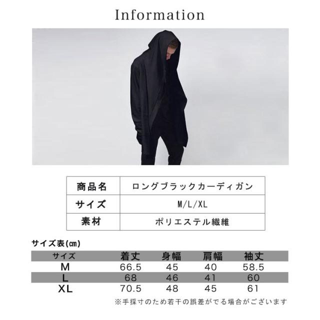 | サイズについての説明 | 【サイズ】M/L/XL Mサイズ/着丈66.5cm、身幅45cm、肩幅40cm、袖丈58.5cm Lサイズ/着丈68cm、身幅46cm、肩幅41cm、袖丈60cm XLサイズ/着丈70.5cm、身幅48cm、肩幅45cm、袖丈61cm ※多少誤差が生じる場合がございます。 ご了承ください。 シンプルで男女ともにお使いいただける ブラックロングカーディガン♪ |