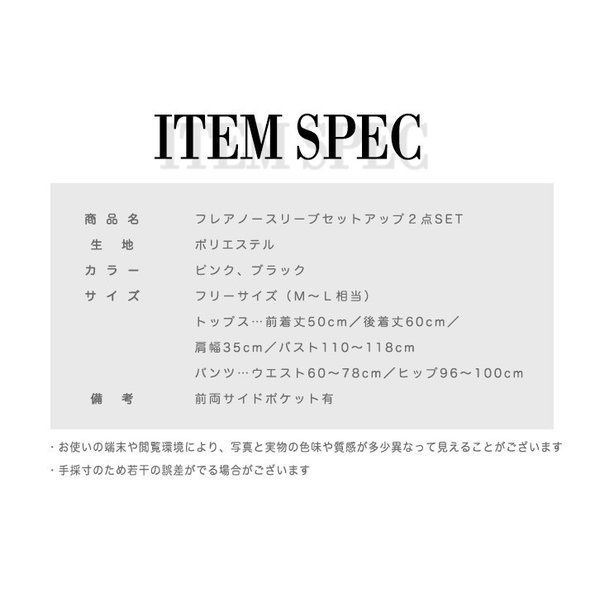 | サイズについての説明 | 【サイズ】フリーサイズ(M~L相当) 【トップス】前着丈50cm/後着丈60cm/肩幅:35cm/バスト:110~118cm 【パンツ】ウエスト: 60~78cm/ヒップ: 96~100cm 【備考】前両サイドポケット有り |