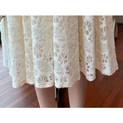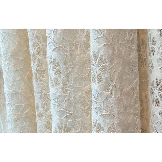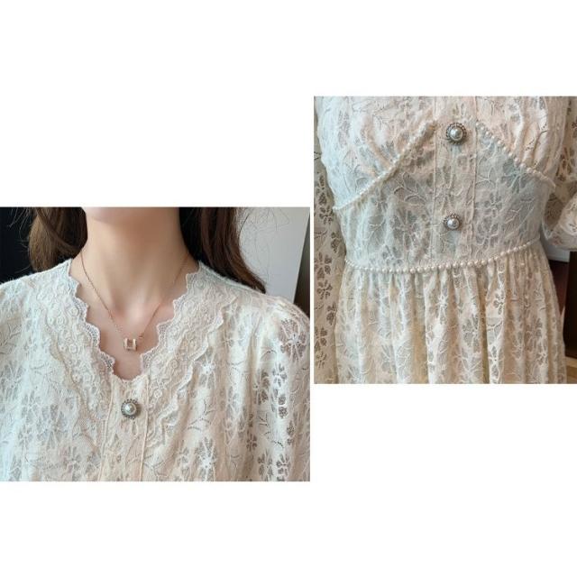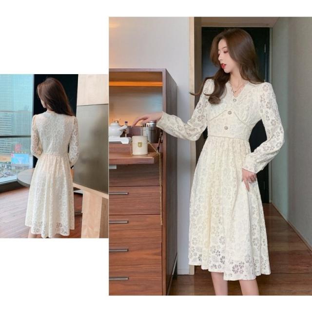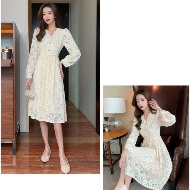 ワンピース Aライン レディース 女性 長袖 ミディアム丈 膝丈 Vネック 前ボタン 総レース フレア ハイウエスト 花柄 フラワー お洒落 可愛い