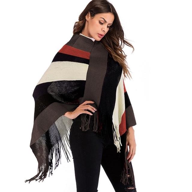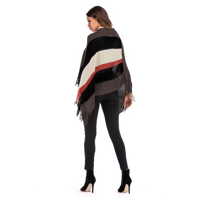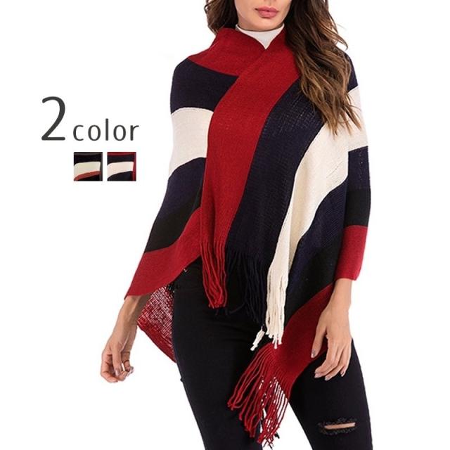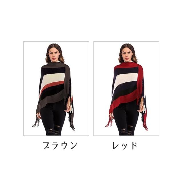 ポンチョ ニット ケープ マント ショール 羽織 レディース 女性 婦人服 ボーダー柄 フリンジ おしゃれ かわいい カジュアル
