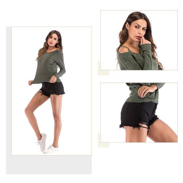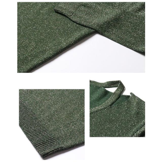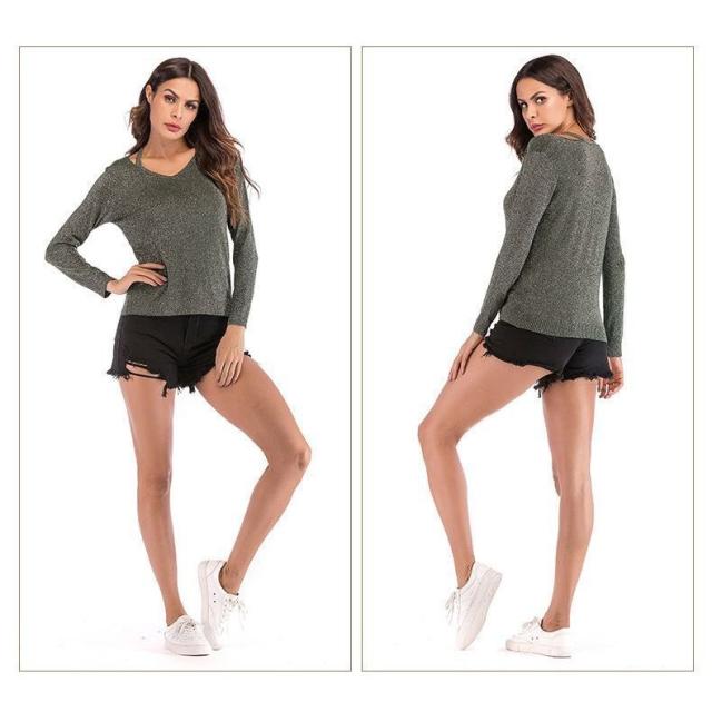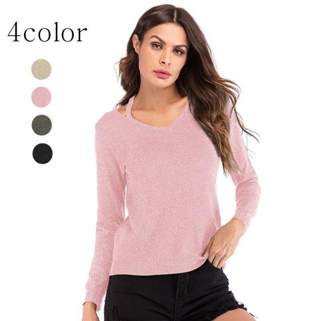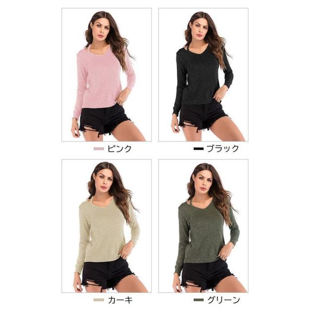 ニット レディース 女性用 トップス 長袖 Vネック 無地 ラメ 穴あき 袖リブ 裾リブ シンプル おしゃれ カジュアル 肩見せ 着回し力 ヘビロテ