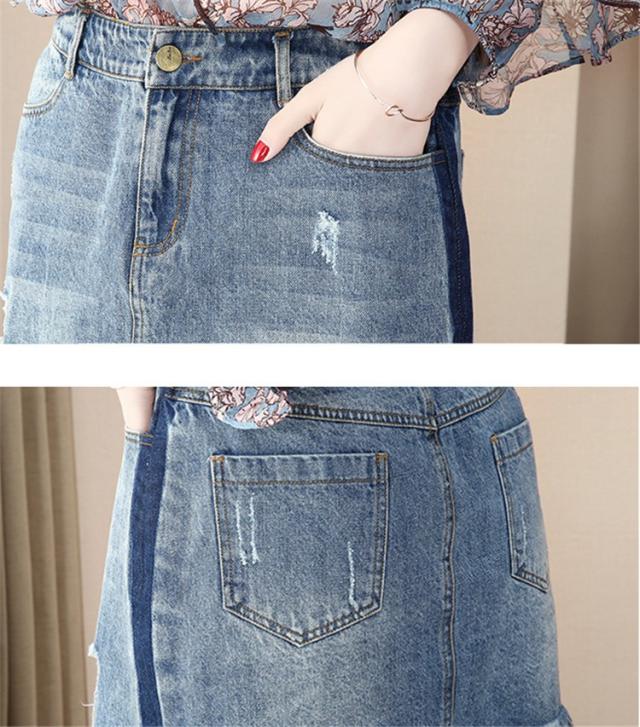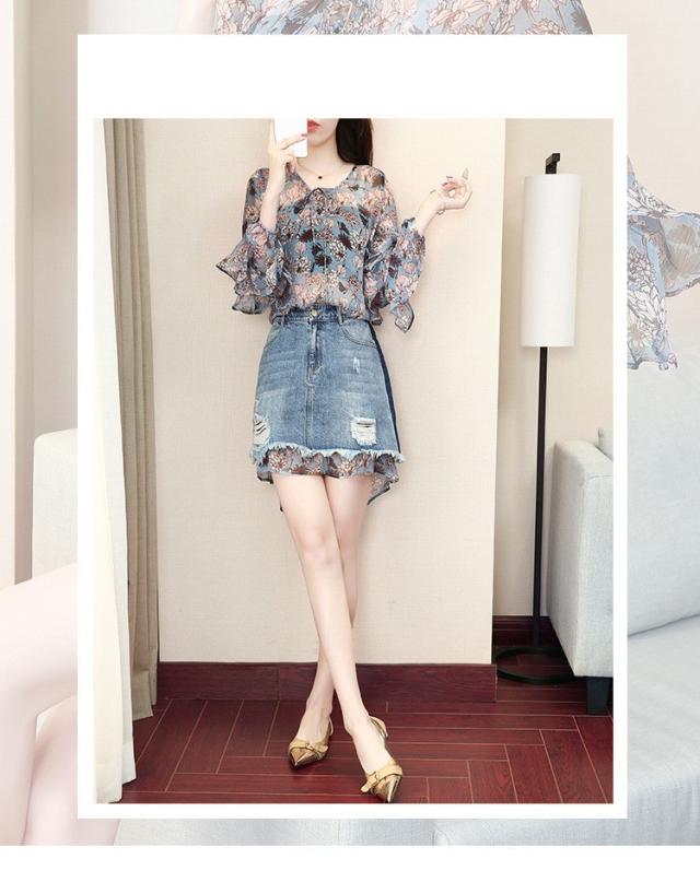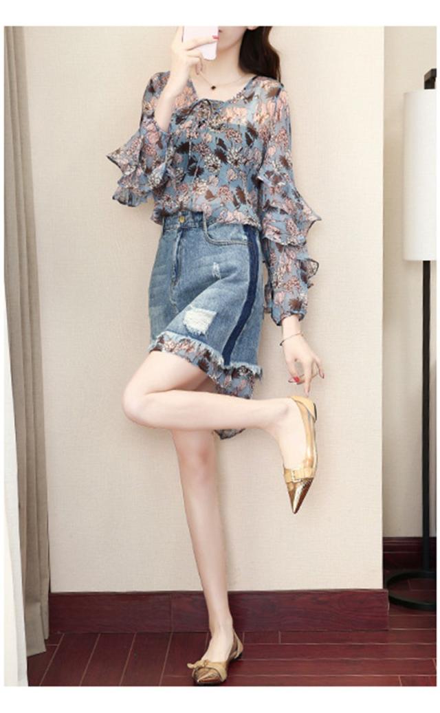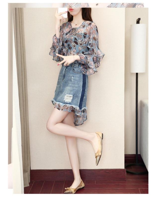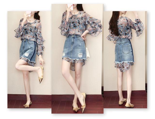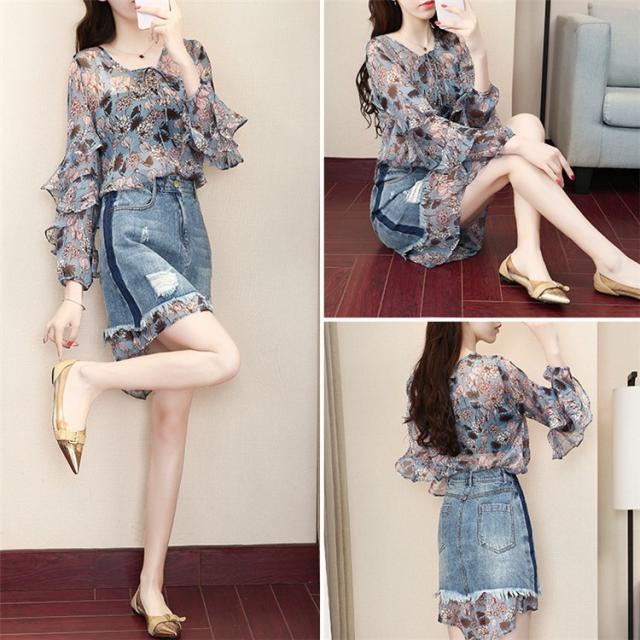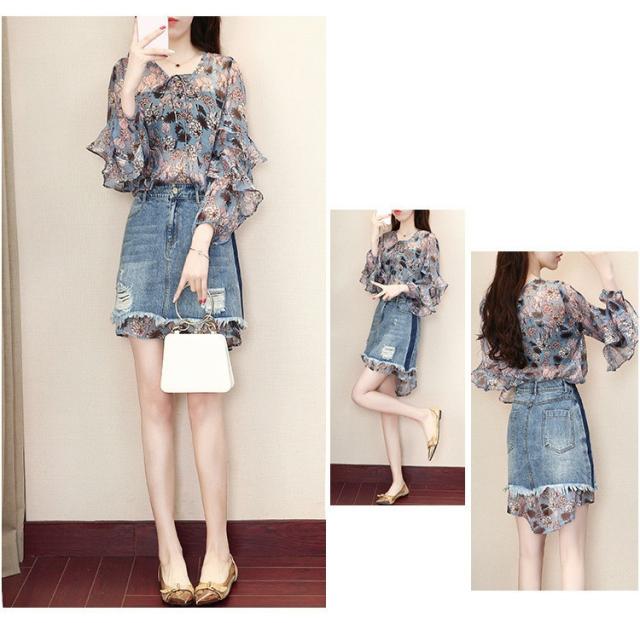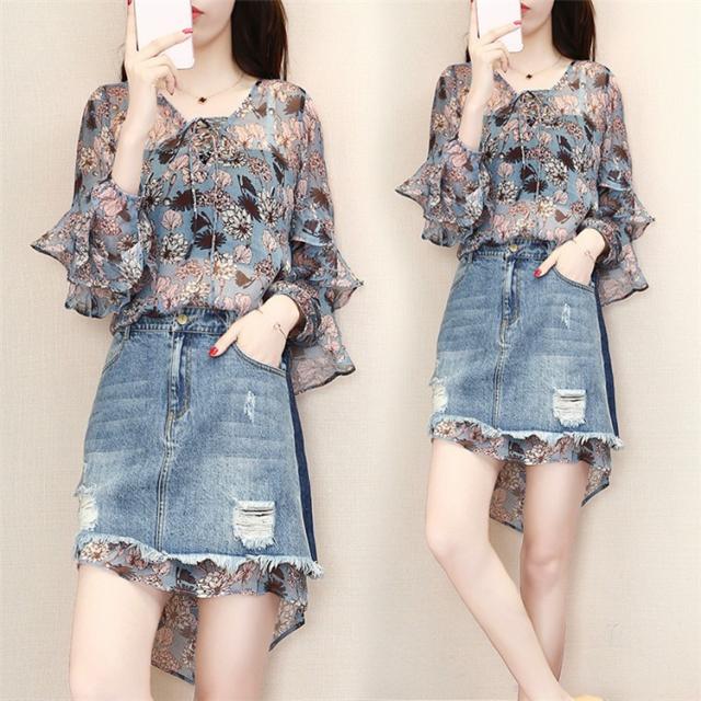 スーツセットアップ レディース 春秋 シフォン シャツ 花柄 七分袖 2点セットアップ 大きいサイズ ショート丈 デニムスカート 通勤 OL オシャレ 上品 大人 2色