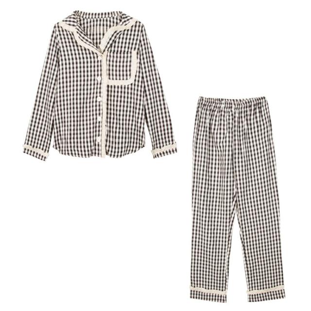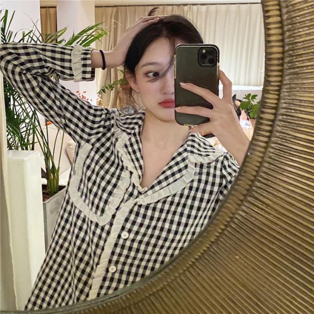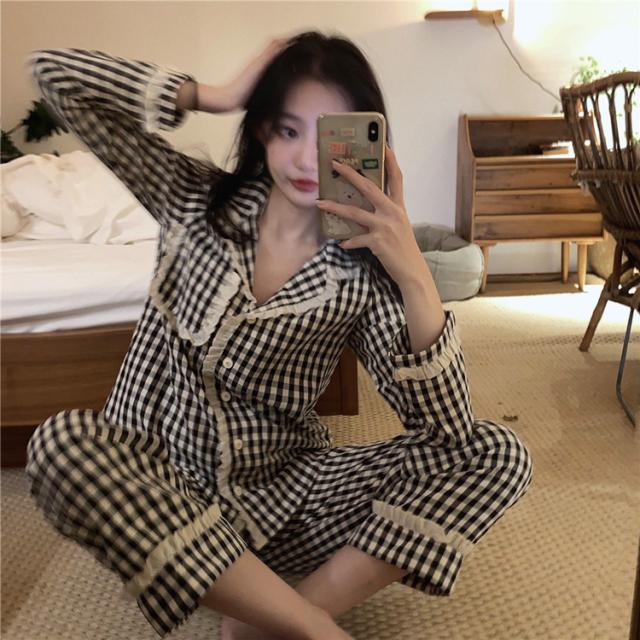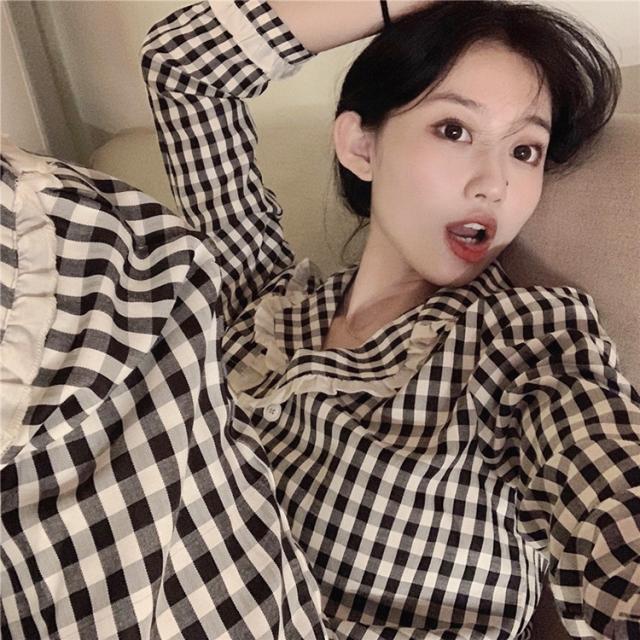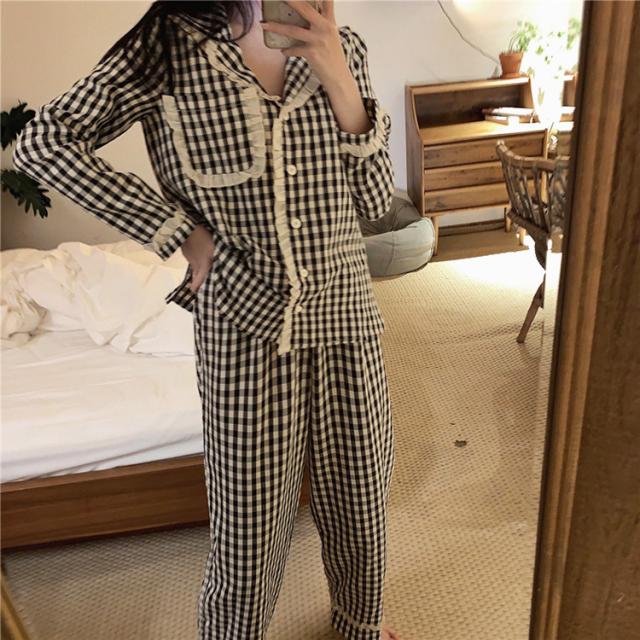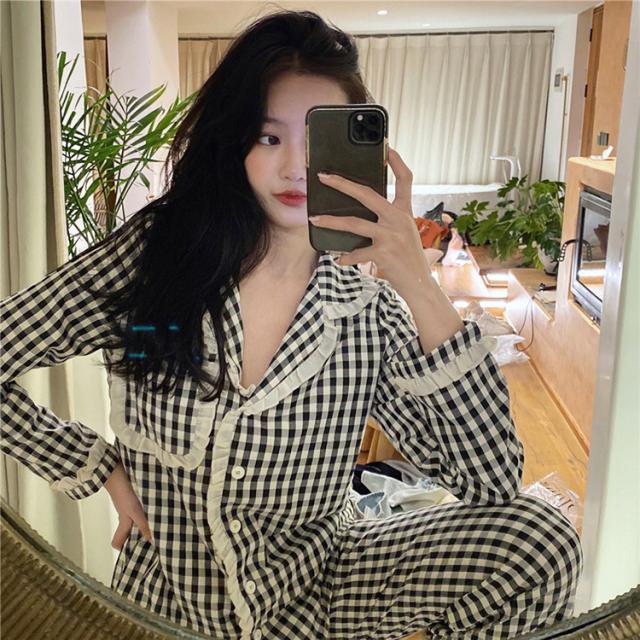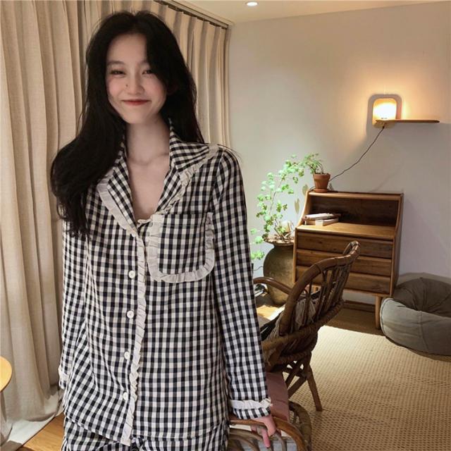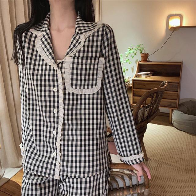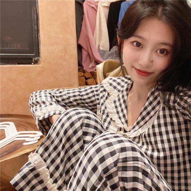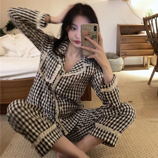 パジャマ ルームウェア レディース 春夏秋 長袖パジャマ 前開きレースチェック柄 ルームウェア 可愛い上下セット 韓国風 パジャマ 部屋着 寝巻き オシャレ