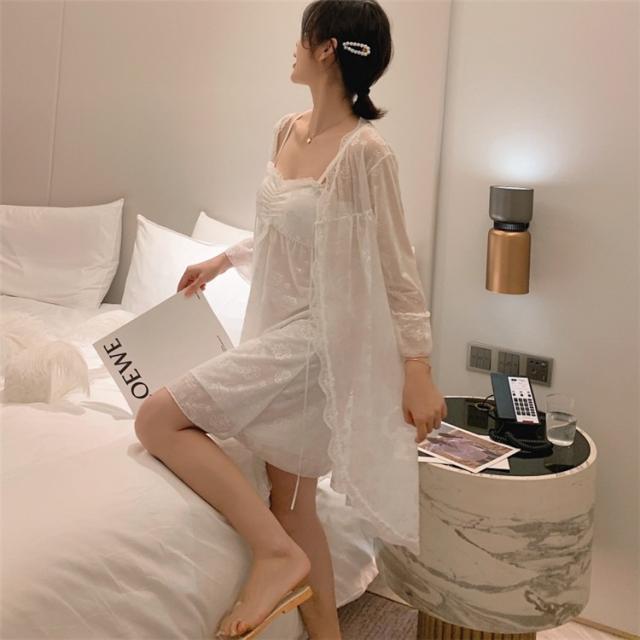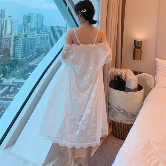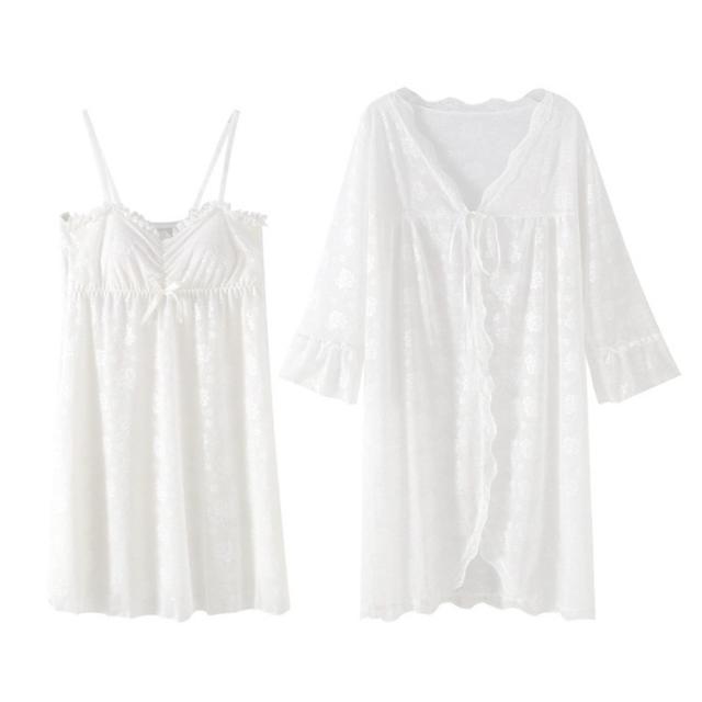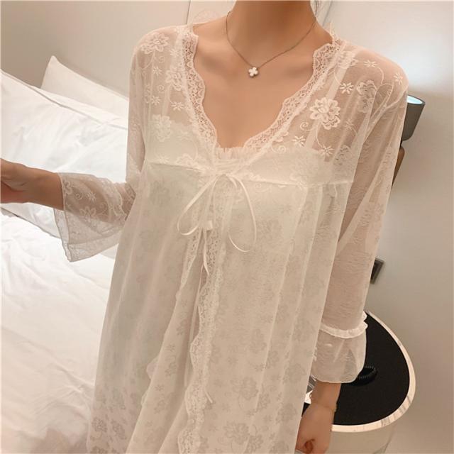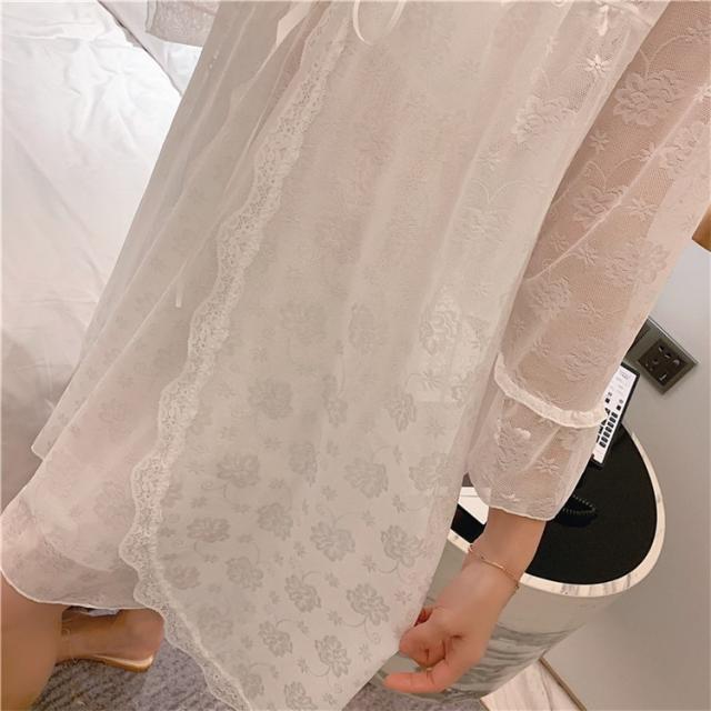 2点セット レディース 白い 姫系 長袖 パジャマ フランネル レース ワンピース ネグリジェ 寝巻き パジャマ ロマンティック 女性用 部屋着 ナイトウェア