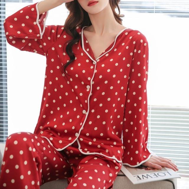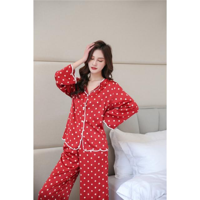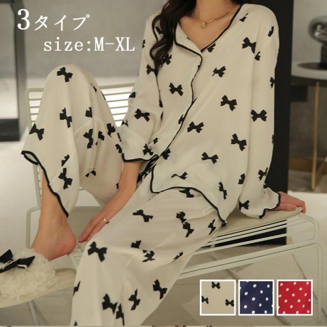 パジャマ レディース 春秋 2点セット アイスシルク パジャマ セットアップ ルームウェア ドット リボン 前開き プリント 長袖 大きいサイズ 部屋着 可愛い