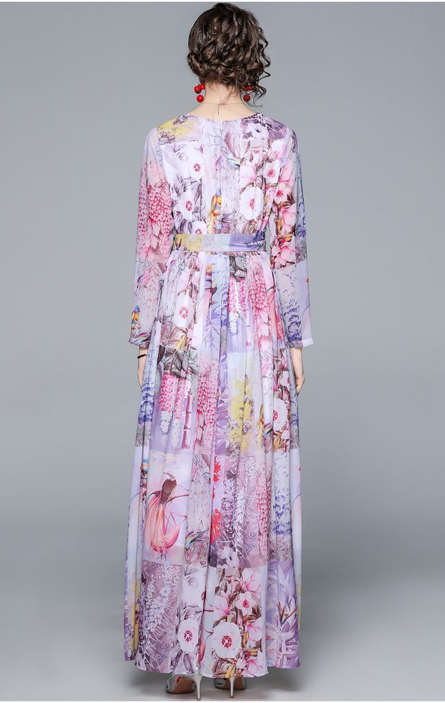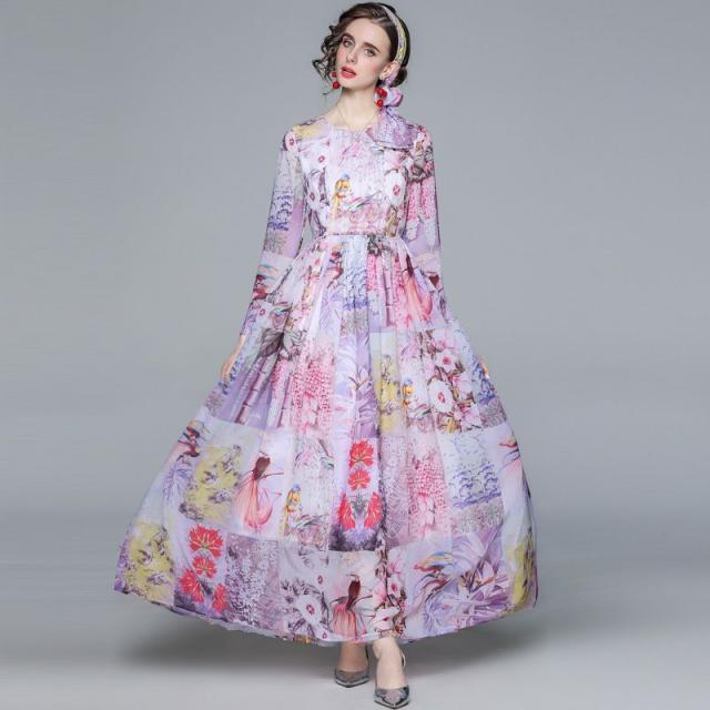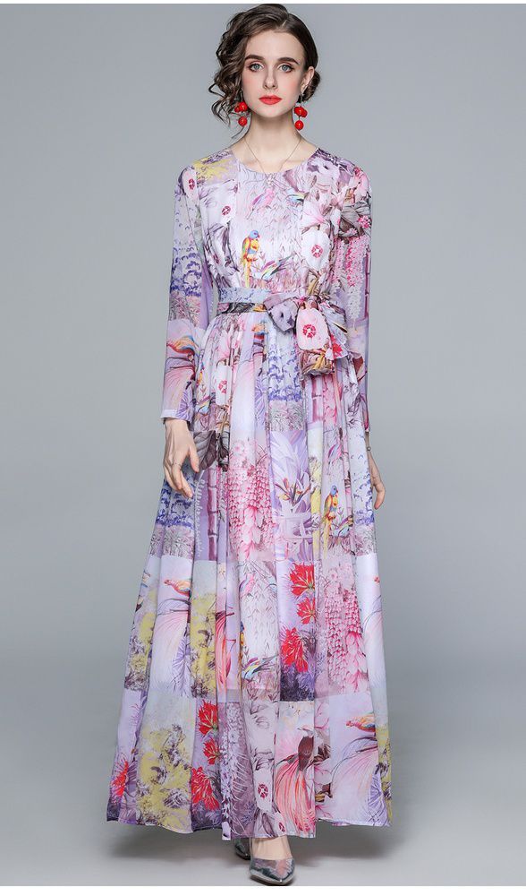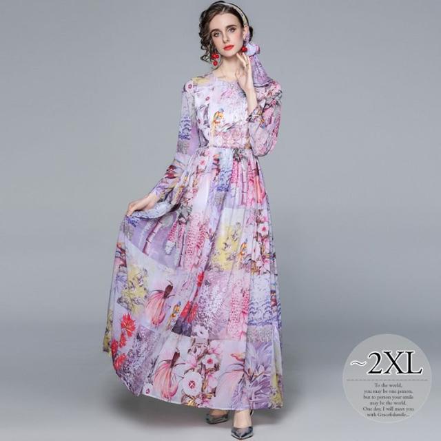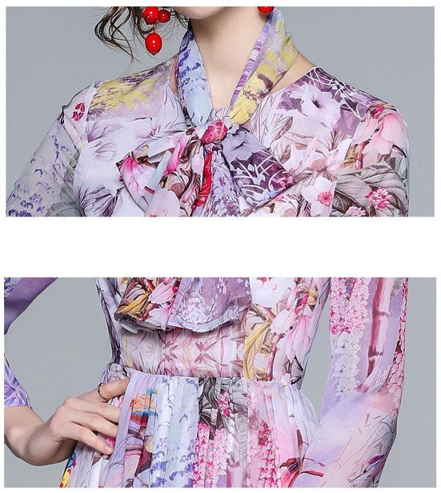 ワンピース ラウンドネック 花柄 長袖 ボウタイリボン 総柄プリント 美人 お出かけ 休日 女子旅 ママスタイル かわいい ガーリー