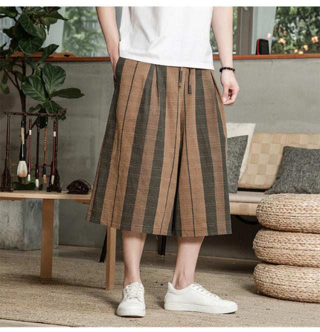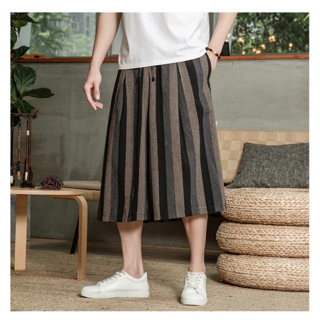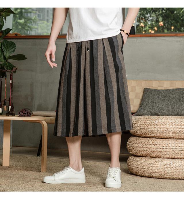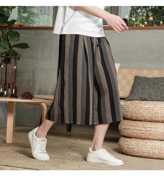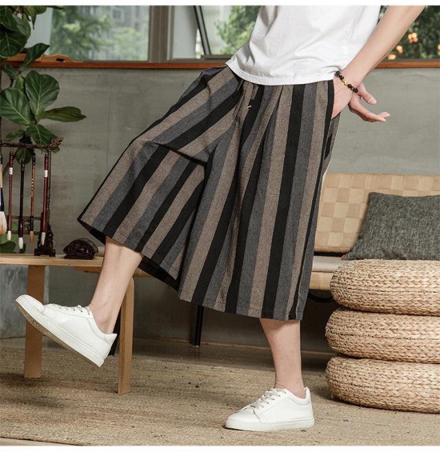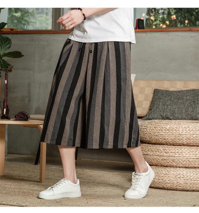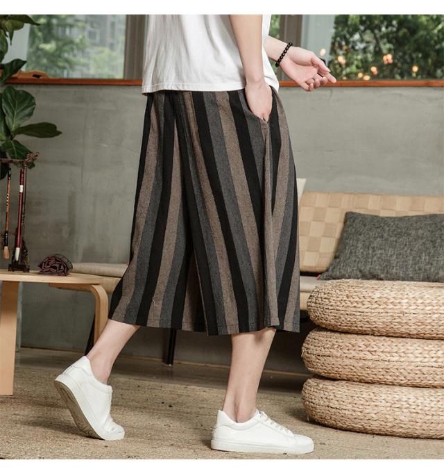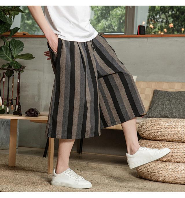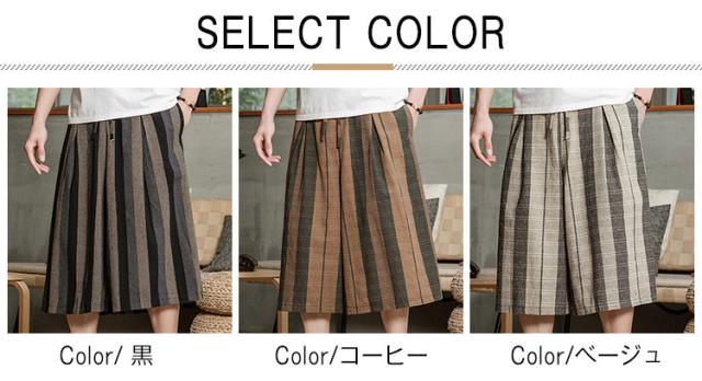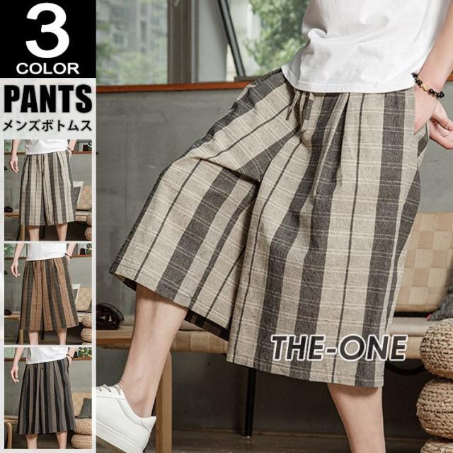 リネンパンツ メンズ クロップドパンツ ワイドパンツ 綿麻 七分丈 ゆったり ストライプ ウエストゴム 夏