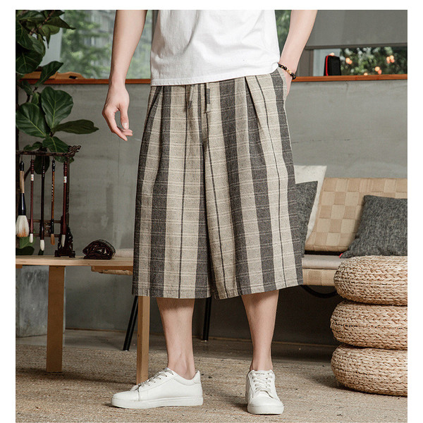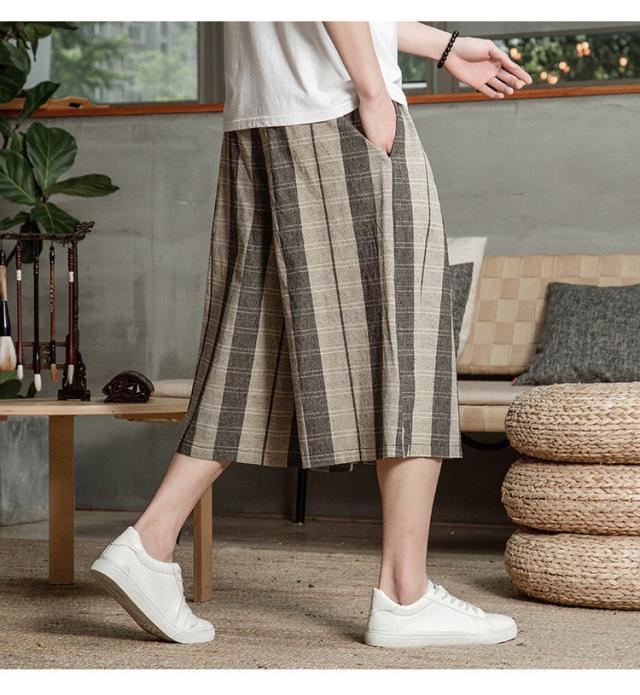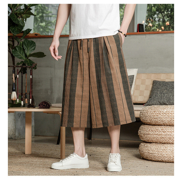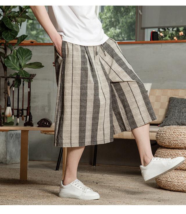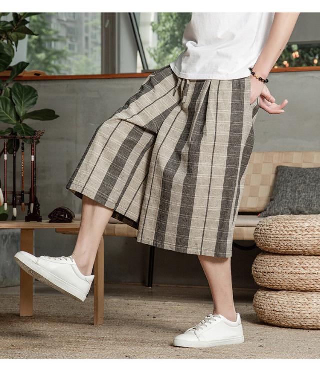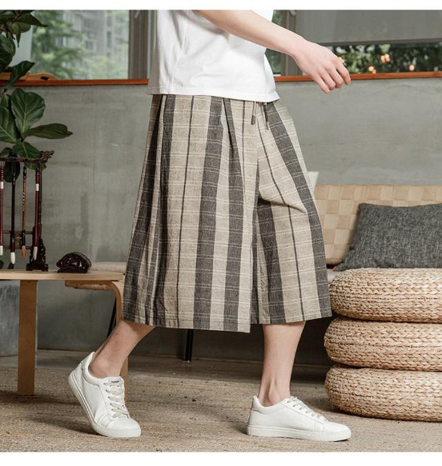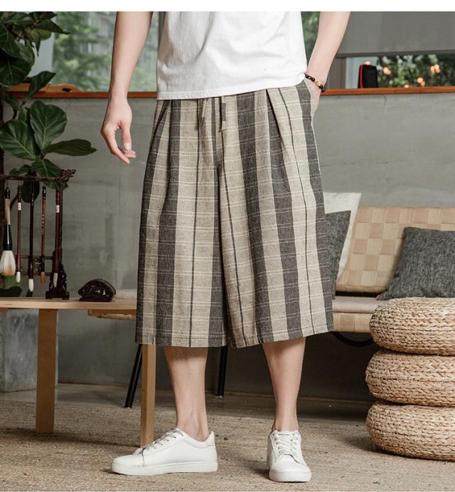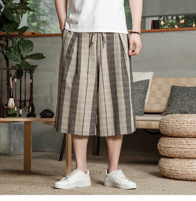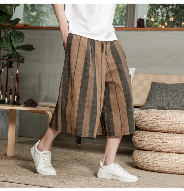 リネンパンツ メンズ クロップドパンツ ワイドパンツ 綿麻 七分丈 ゆったり ストライプ ウエストゴム 夏