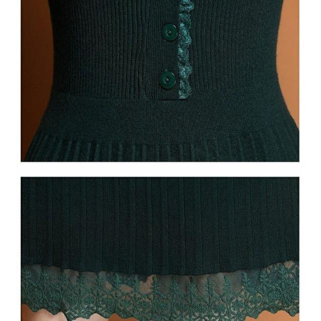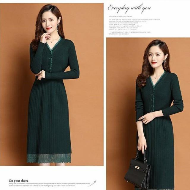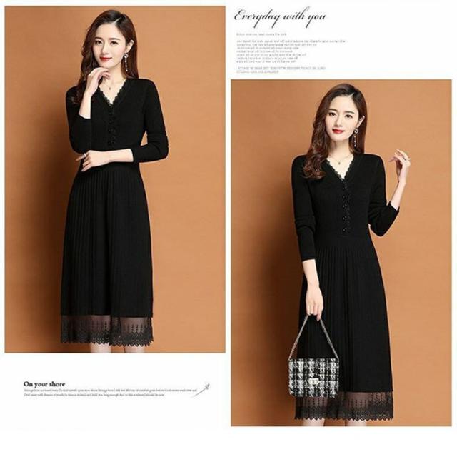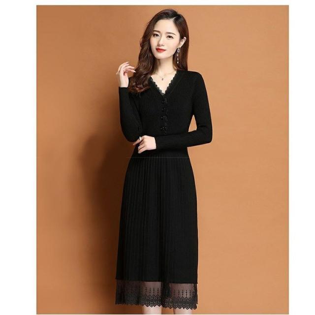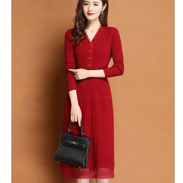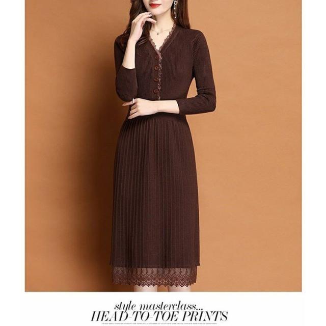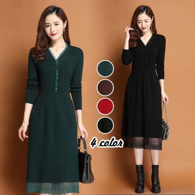 ニットワンピース レディース 40代 秋冬 きれいめ Vネック ワンピース 長袖 レース Aラインプリーツスカート ニット 通勤 ロング 着痩せ オシャレ