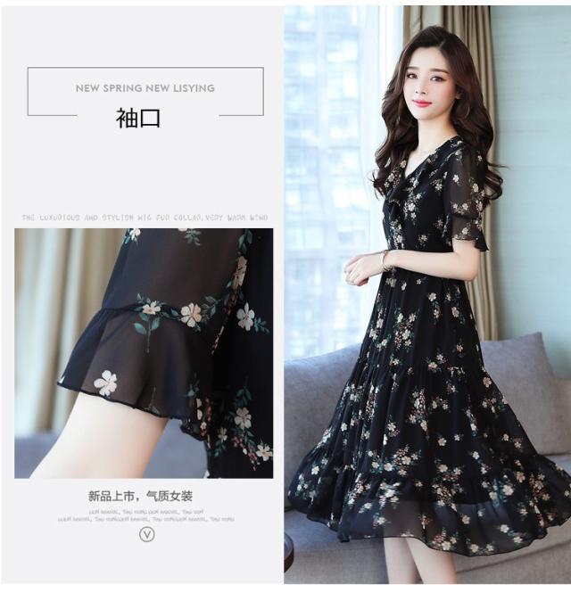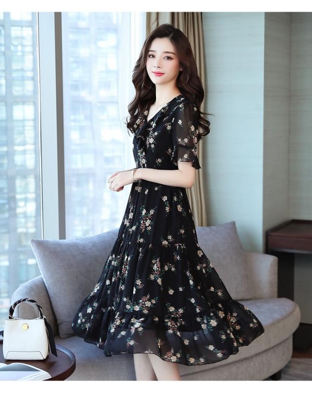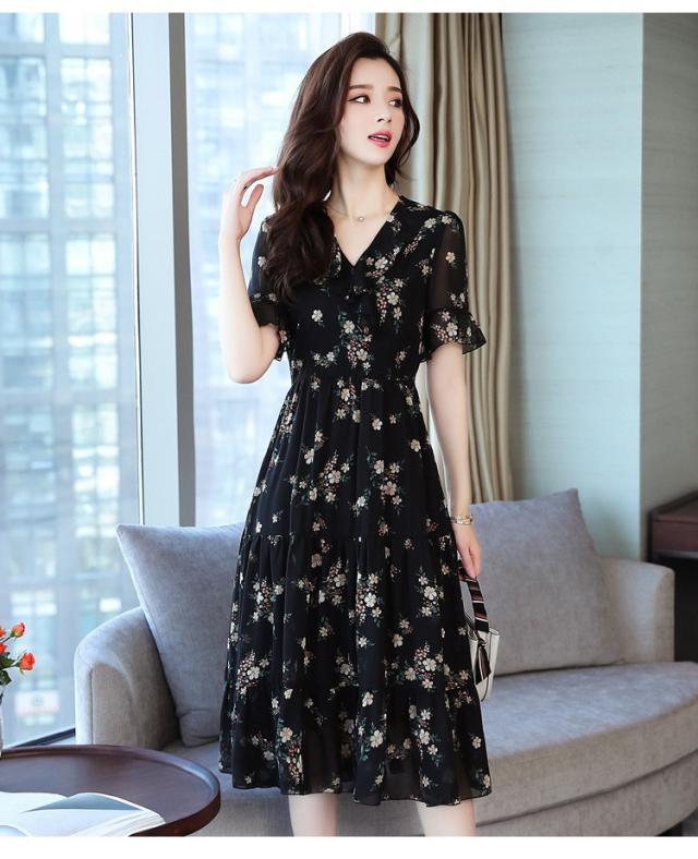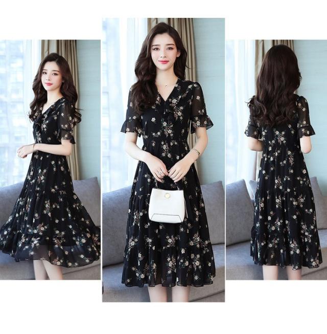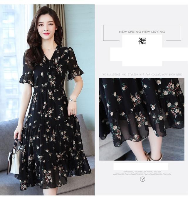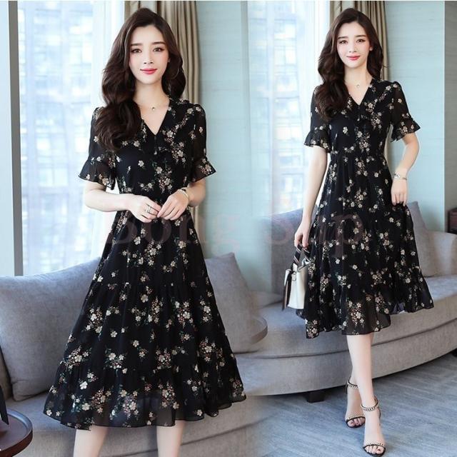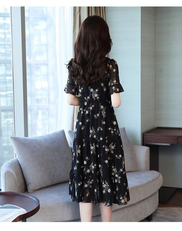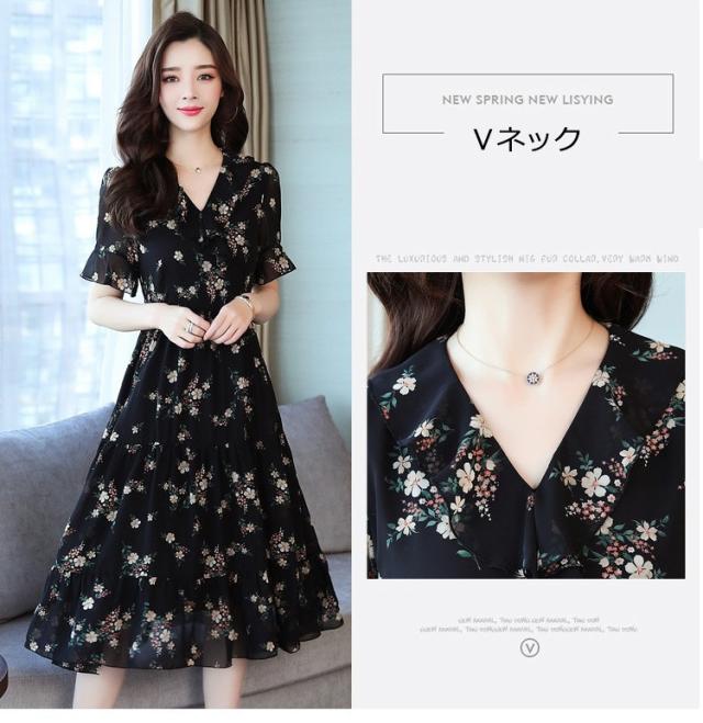 ワンピース レディース 40代 シフォンワンピース 春夏 膝丈ワンピース 半袖 Vネック 花柄 ロングスカート オシャレ 体型カバー お出かけ 大人可愛い30代 50代