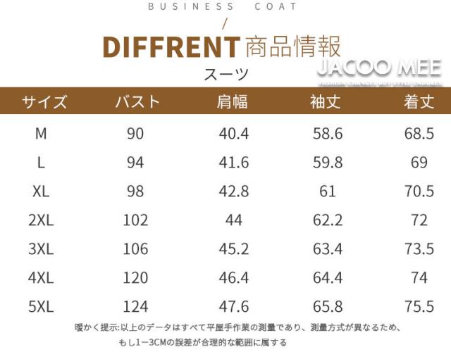 | サイズについての説明 | 実寸: ジャケット M:着丈68.5cm、バスト90cm L:着丈69cm、バスト94cm XL:着丈70.5cm、バスト98cm 2XL:着丈72cm、バスト102cm 3XL:着丈73.5cm、バスト106cm 4XL:着丈74cm、バスト120cm 5XL:着丈75.5cm、バスト124cm ズボン 29:総長103cm、ウエスト73cm、ヒップ93cm 30:総長104cm、ウエスト77cm、ヒップ96cm 31:総長104cm、ウエスト80cm、ヒップ99cm 32:総長104cm、ウエスト83cm、ヒップ102cm 33:総長105cm、ウエスト87cm、ヒップ105cm 34:総長105cm、ウエスト90cm、ヒップ108cm 35:総長106cm、ウエスト93cm、ヒップ111cm 36:総長107cm、ウエスト96cm、ヒップ114cm 38:総長108cm、ウエスト99cm、ヒップ116cm 40:総長109cm、ウエスト102cm、ヒップ119cm |