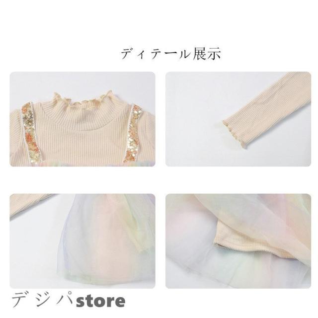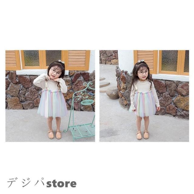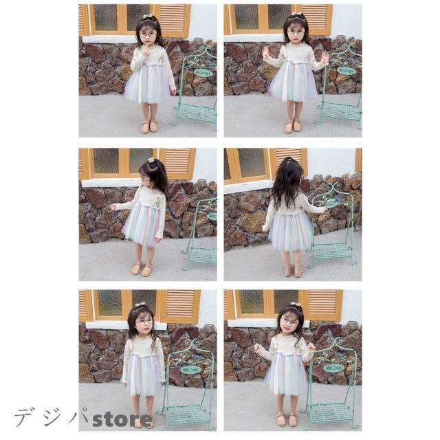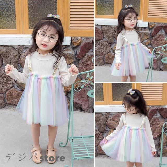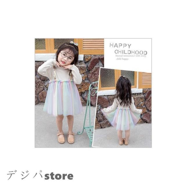 子供服 綿 姫系ワンピース 春秋 女の子長袖 膝丈 ひざ丈 切り替え虹柄 チュールスカート プリント おしゃれ 子ども服 女児 シンプル 人気 可愛い