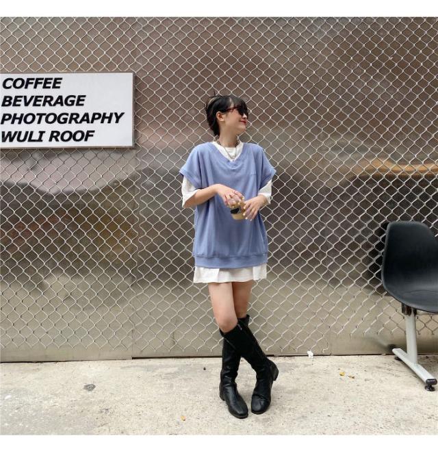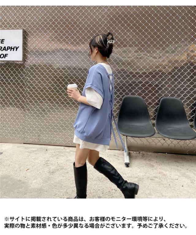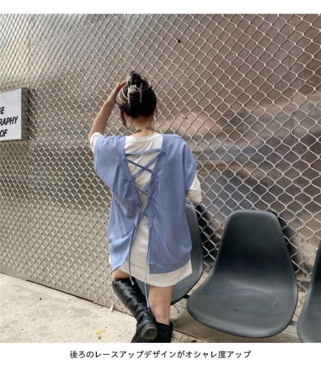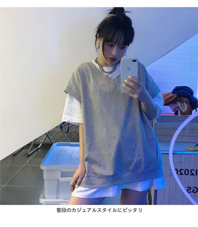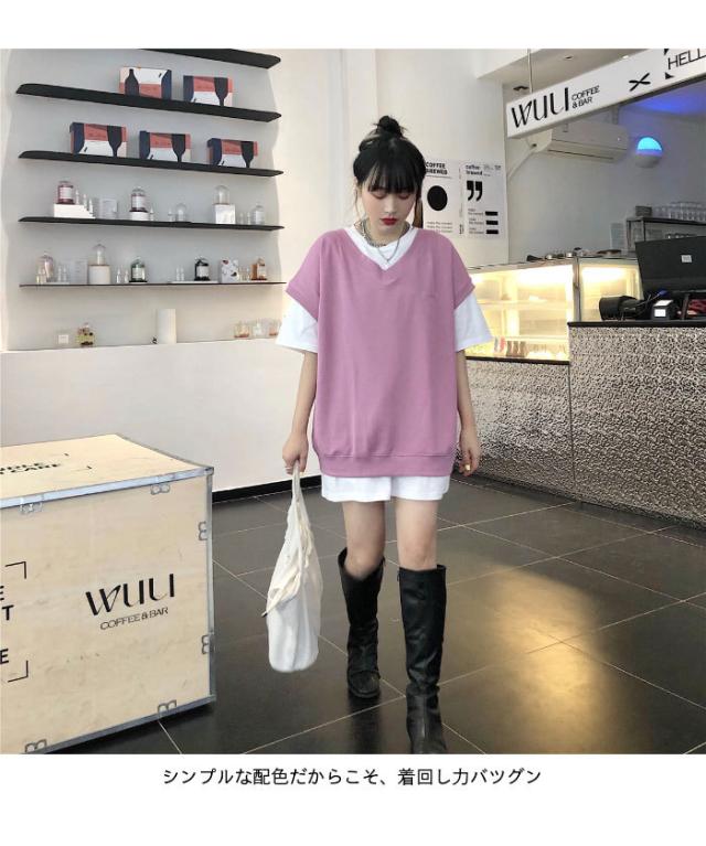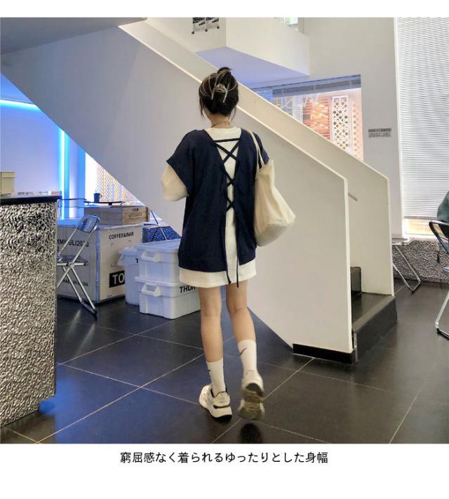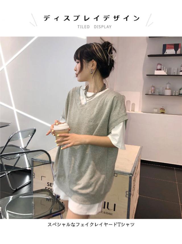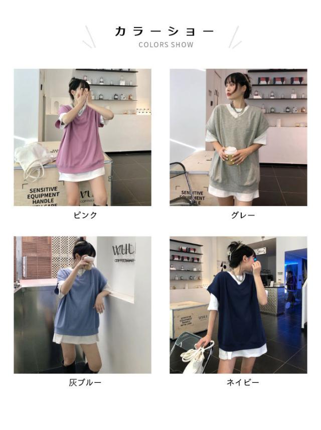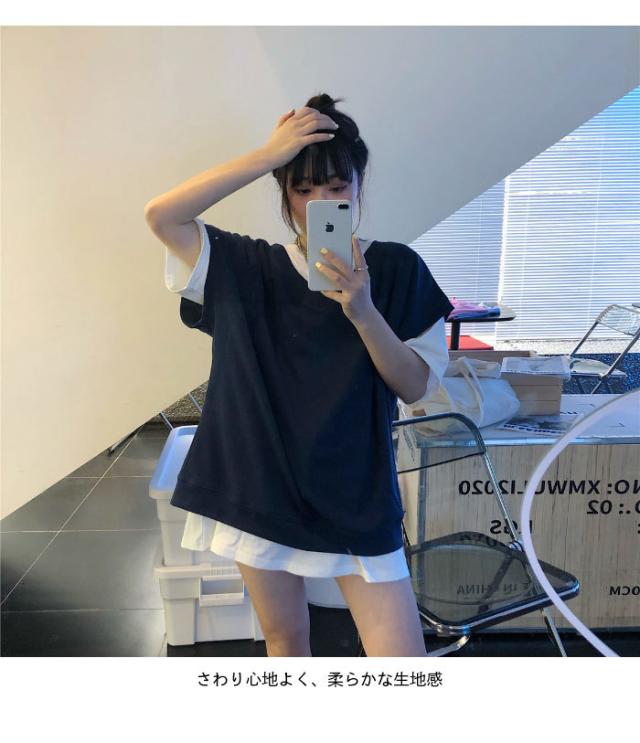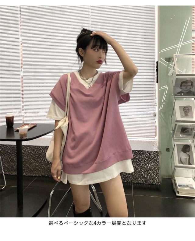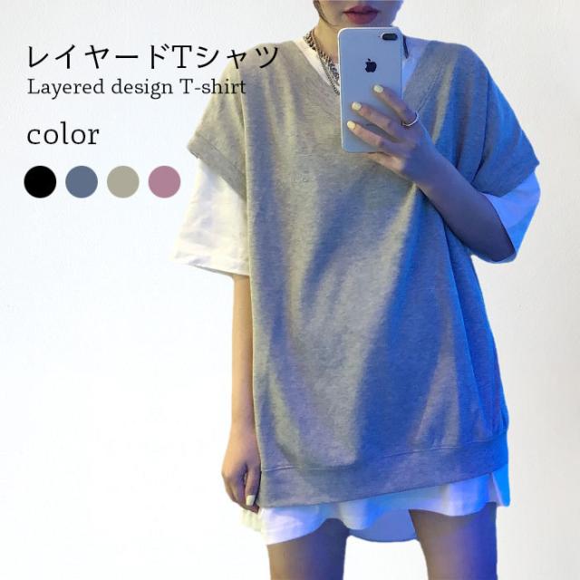 【送料無料】切り替えTシャツ レディース Tシャツ 半袖Tシャツ フェイクレイヤード 重ね着風 レイヤードTシャツ ロング丈 ロングTシャツ トップス