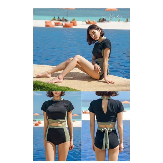 送料無料 水着 レディース ハイネック ビキニ スカート 2点セット レース 無地 上下別柄 シンプル バックシャン ハイウエスト 黒