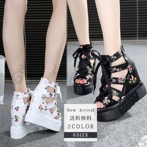 スポーツサンダル レディース 厚底 花柄 ウェッジソール ファスナー 編み上げ インヒール 履きやすい 疲れにくい 靴 カジュアル おしゃれ