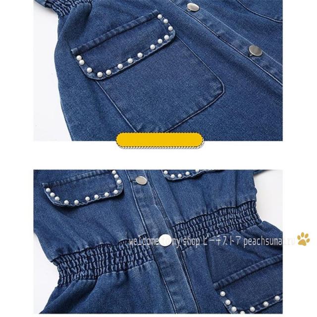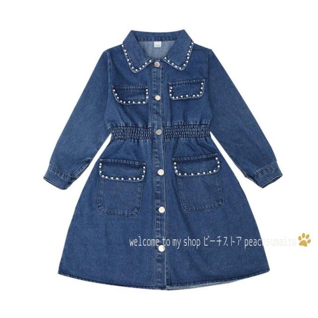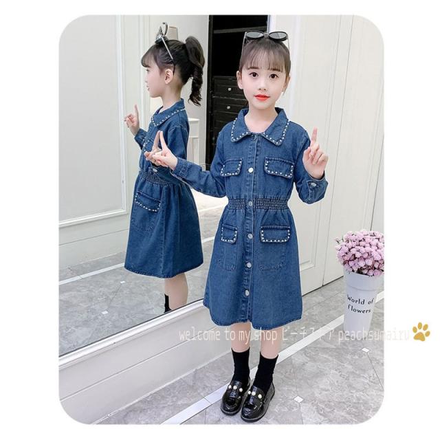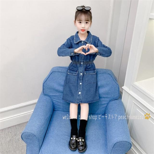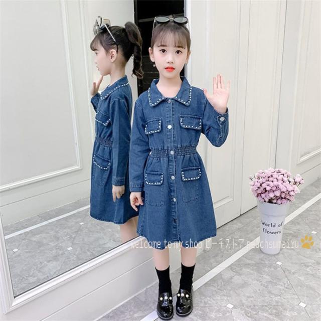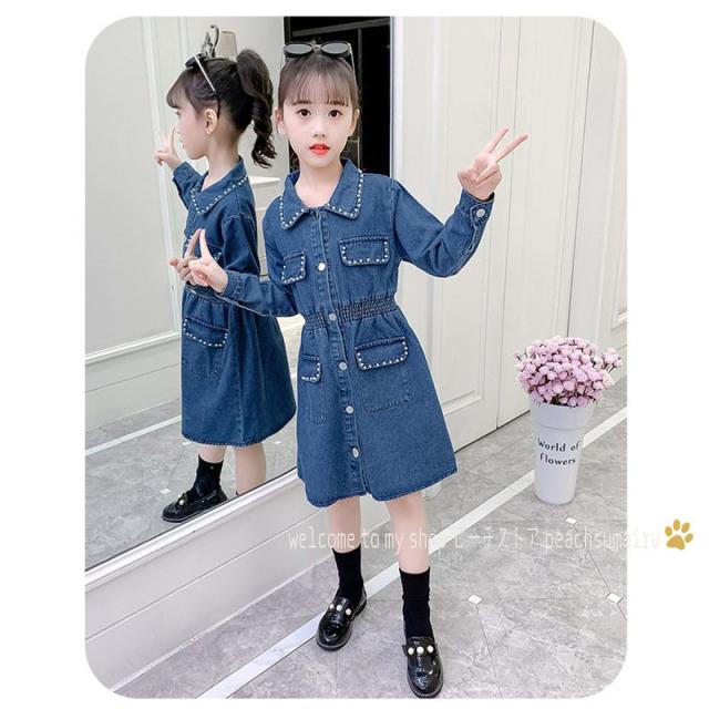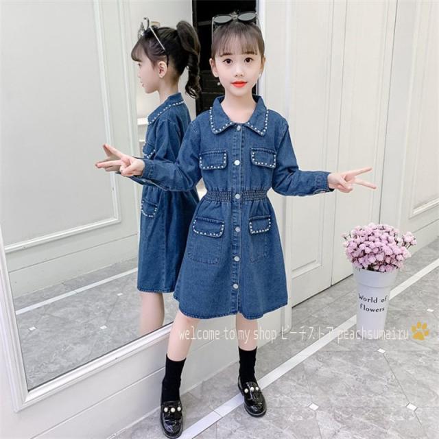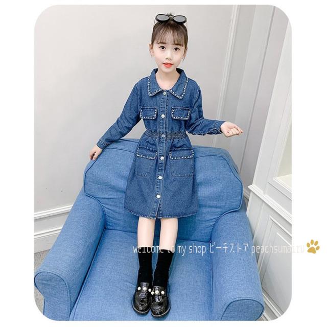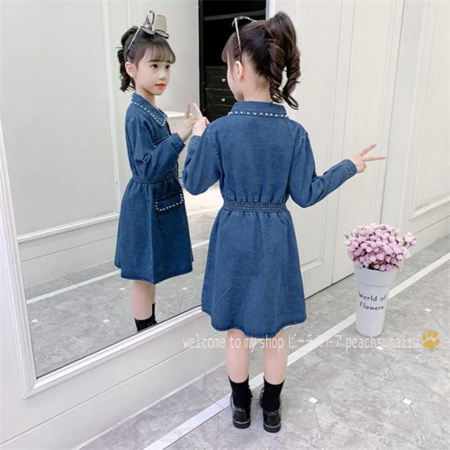 韓国子供服 女の子 ワンピースドレス チュールワンピース 長袖 デニム ワンピース 小学生 子ども服 ジュニア 通学 110-160cm