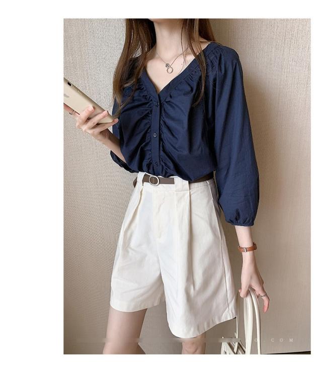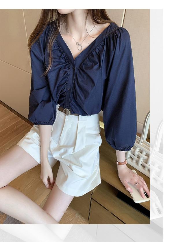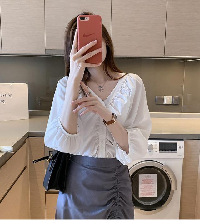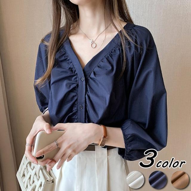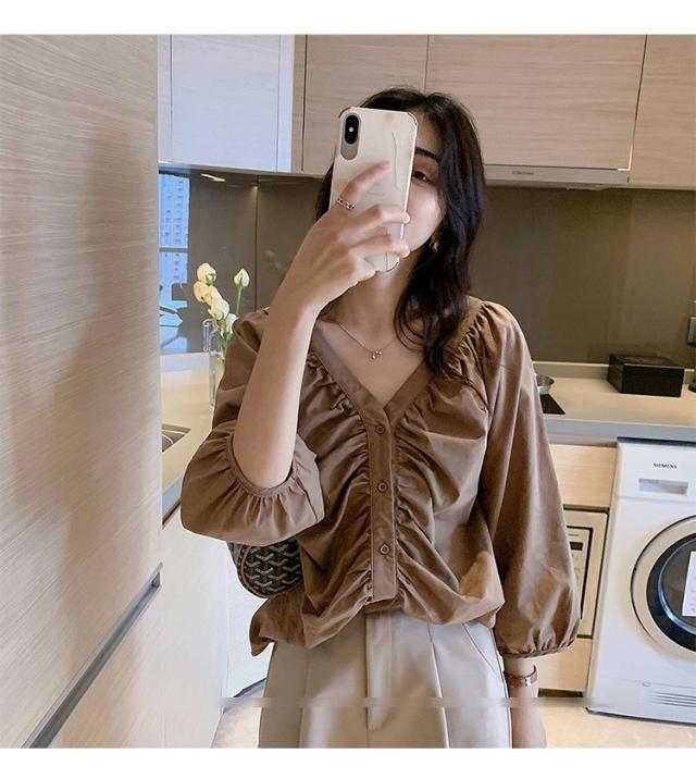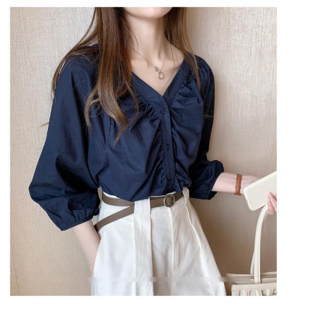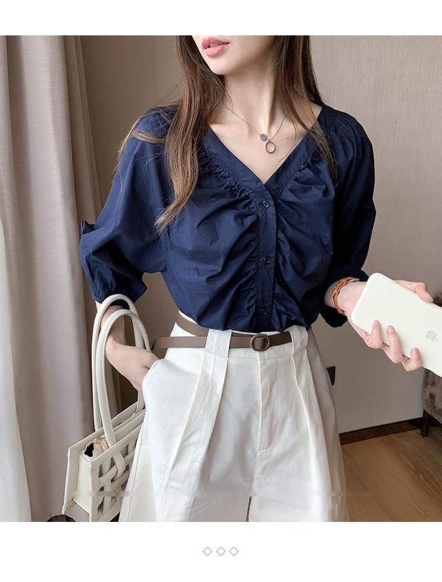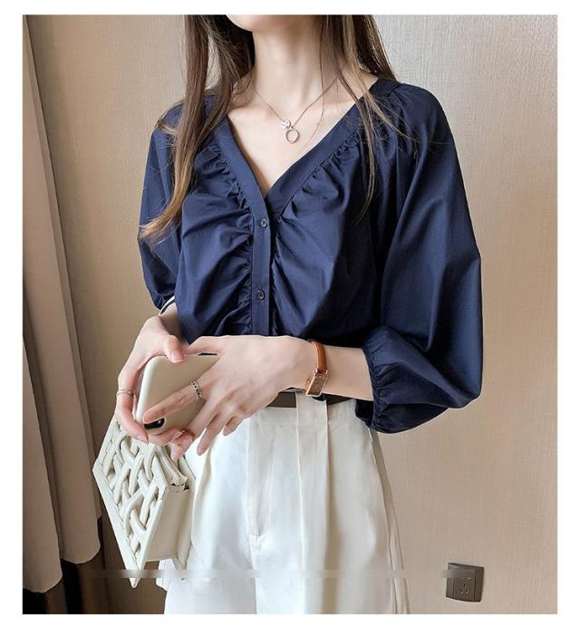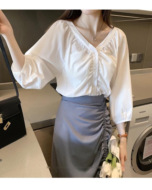 ブラウス レディース 40代 春夏秋 オシャレブラウス 五分袖 パフスリーブ トップス白 VネックTシャツブラウス 大人韓国風 大きいサイズシャツ30代 50代