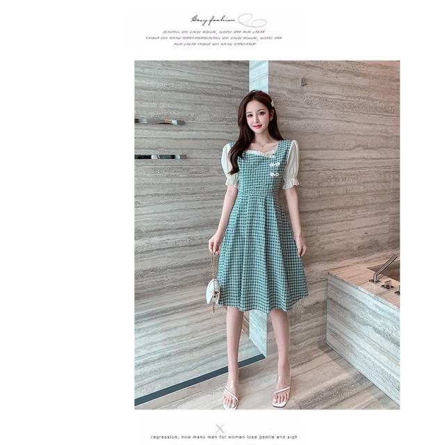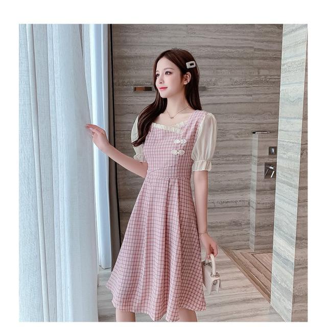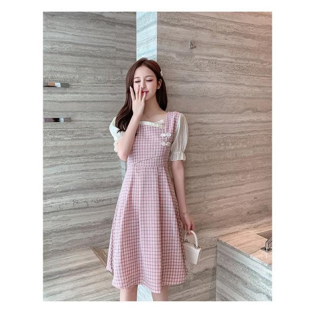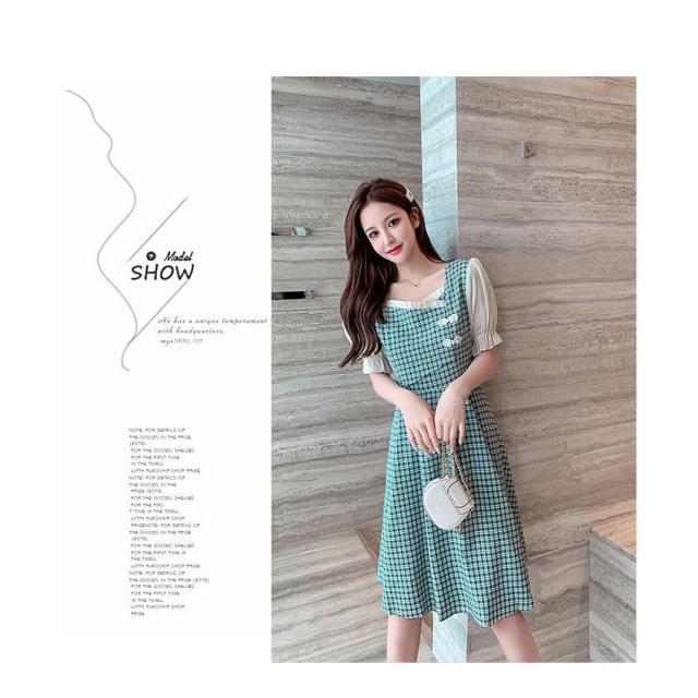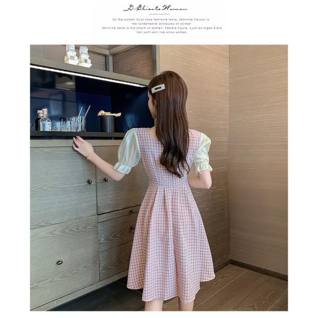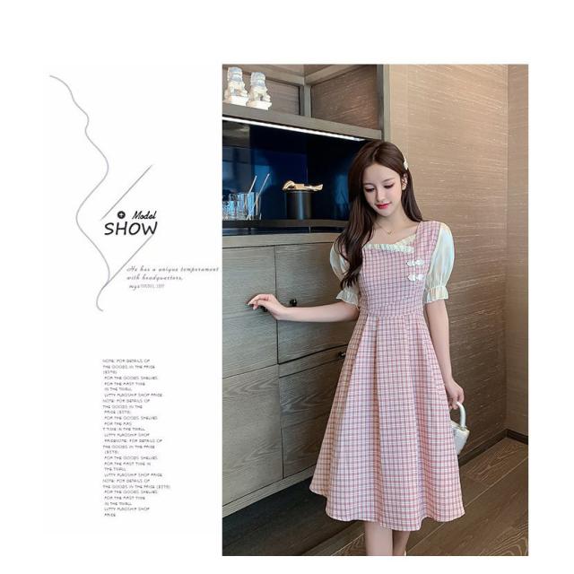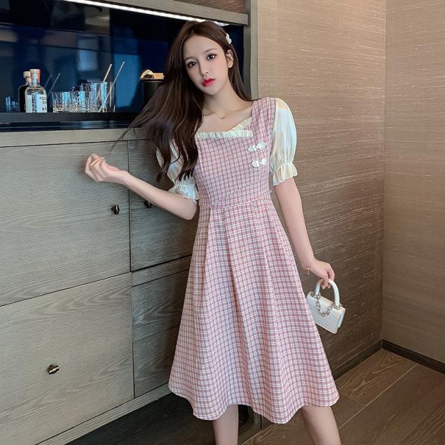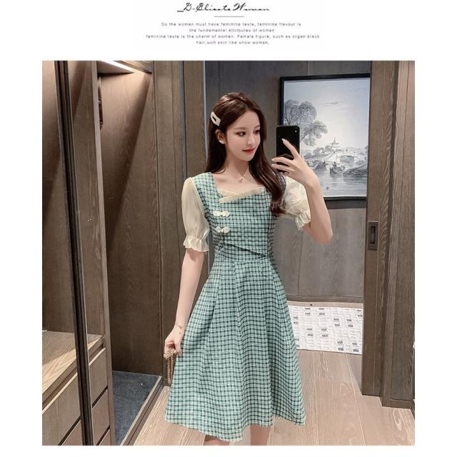 ワンピース レディース 中国風 2021新作 チェック柄 スクエアネック フレア フェミニン 半袖 ハイウエスト 膝丈 Aラインワンピース 人気 上品 きれいめ 日常感