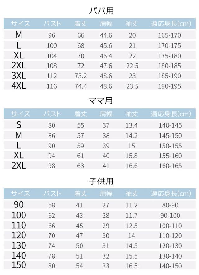 | サイズ | パパM パパL パパXL パパ2XL パパ3XL パパ4XL ママS ママM ママL ママXL ママ2XL 子供90 子供100 子供110 子供120 子供130 子供140 子供150 |