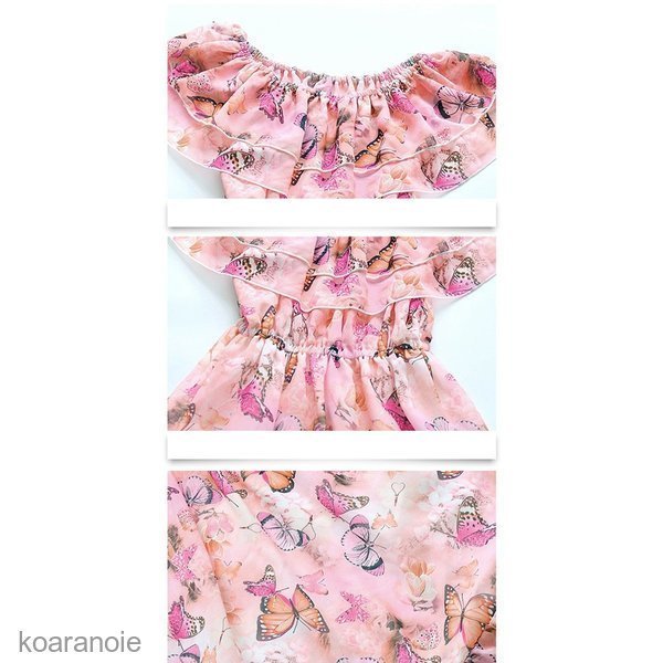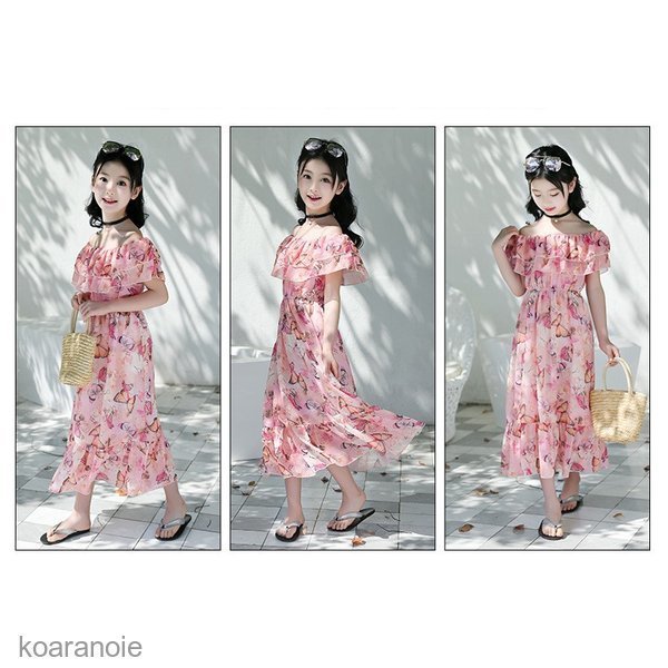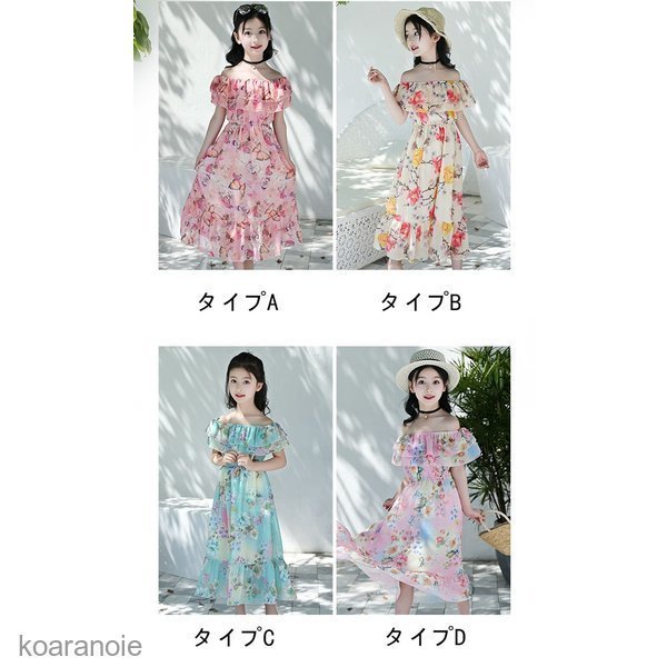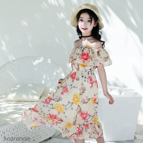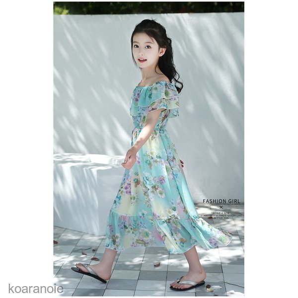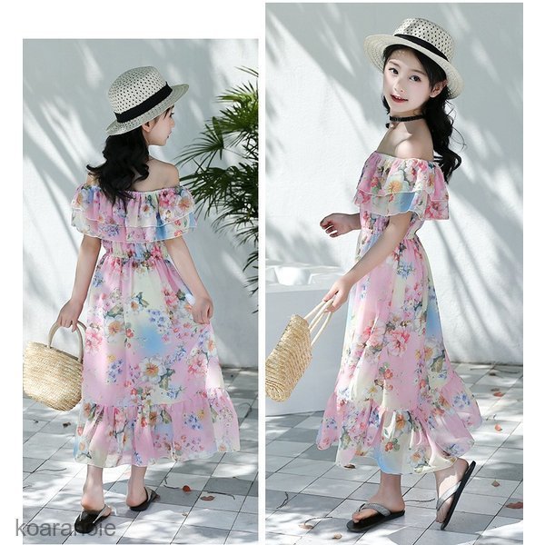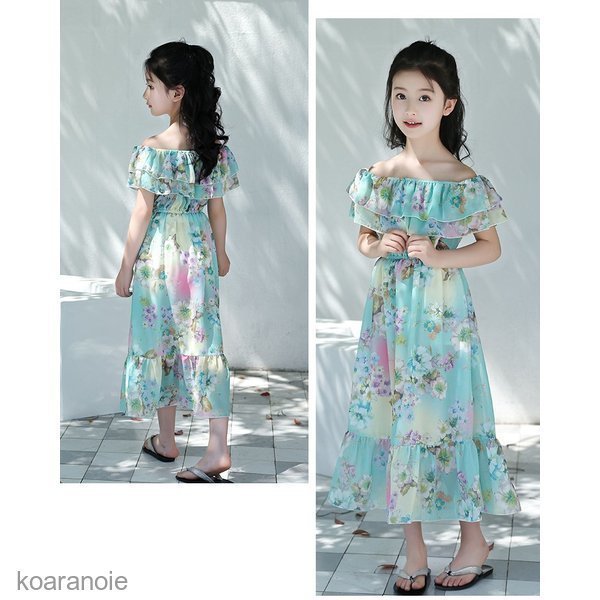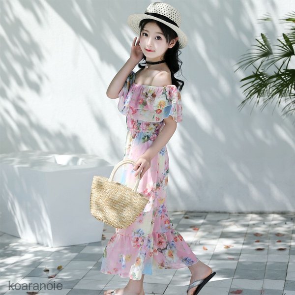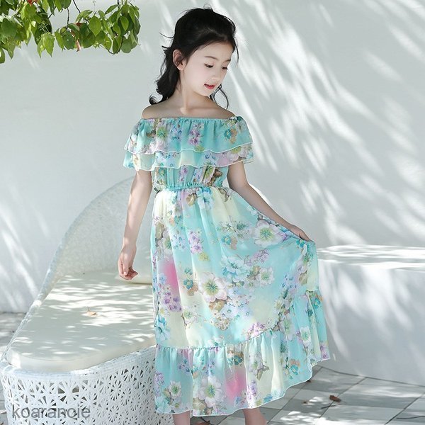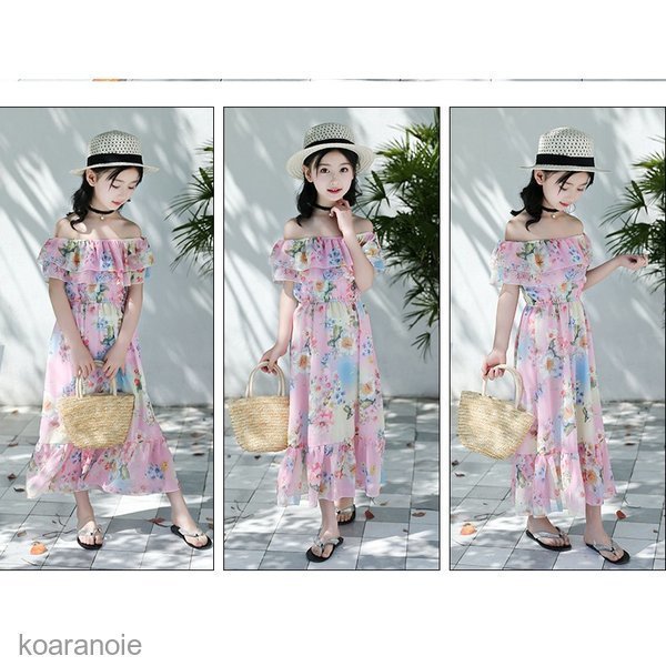 子供服 花柄 ワンピース ボヘミアン ロング 女の子 一字襟 シフォン 半袖 オフショルダー サンドレス リゾート おしゃれ 夏 ビーチ 無地 人気 可愛い